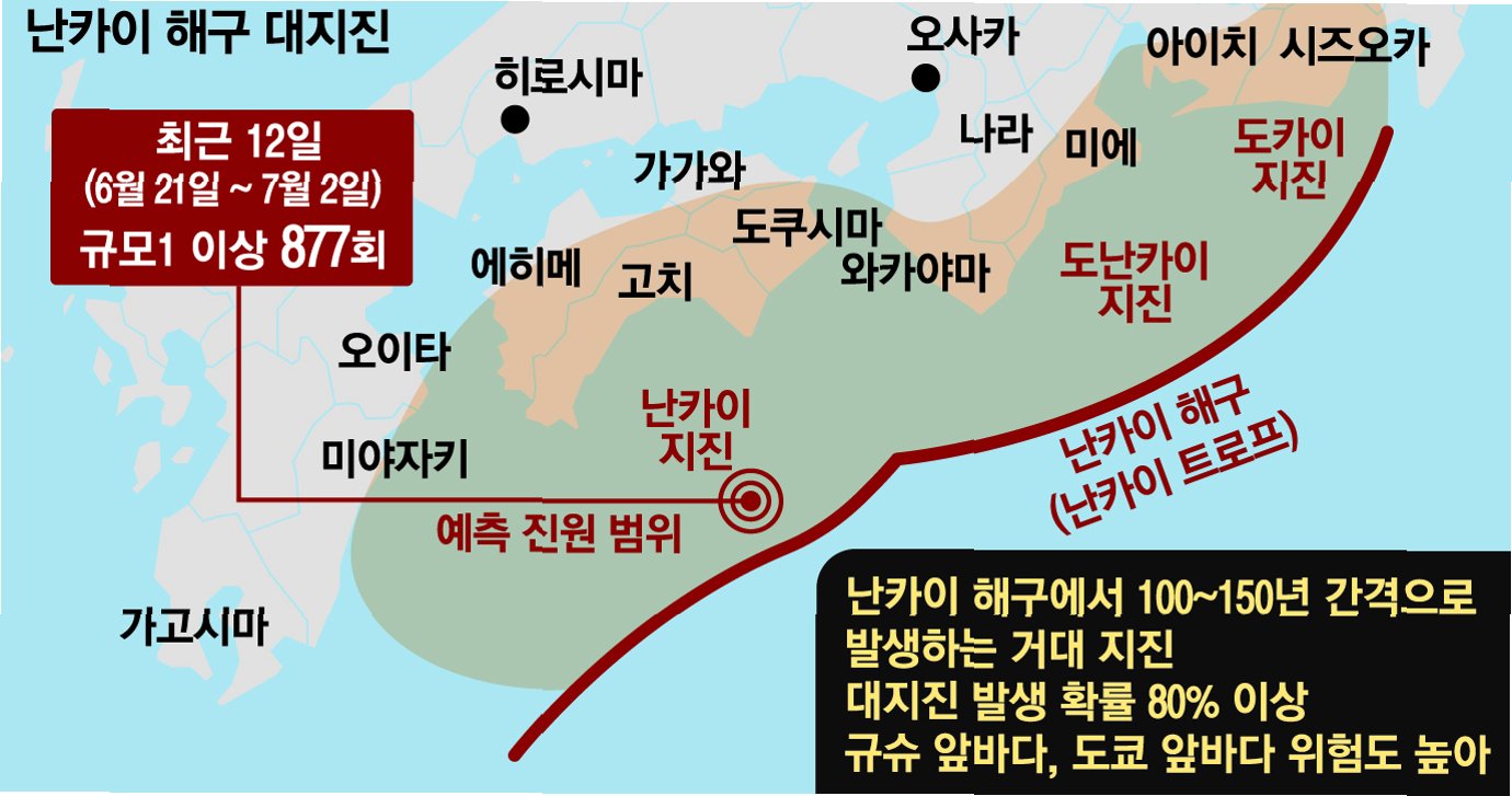 A.일본 시즈오카현 앞바다에서 규슈 동부 해역까지 이어진 난카이 해곡에서 발생하는 규모 8~9의 대형 지진을 말합니다. 역사적으로 100~200년 주기로 발생했습니다.