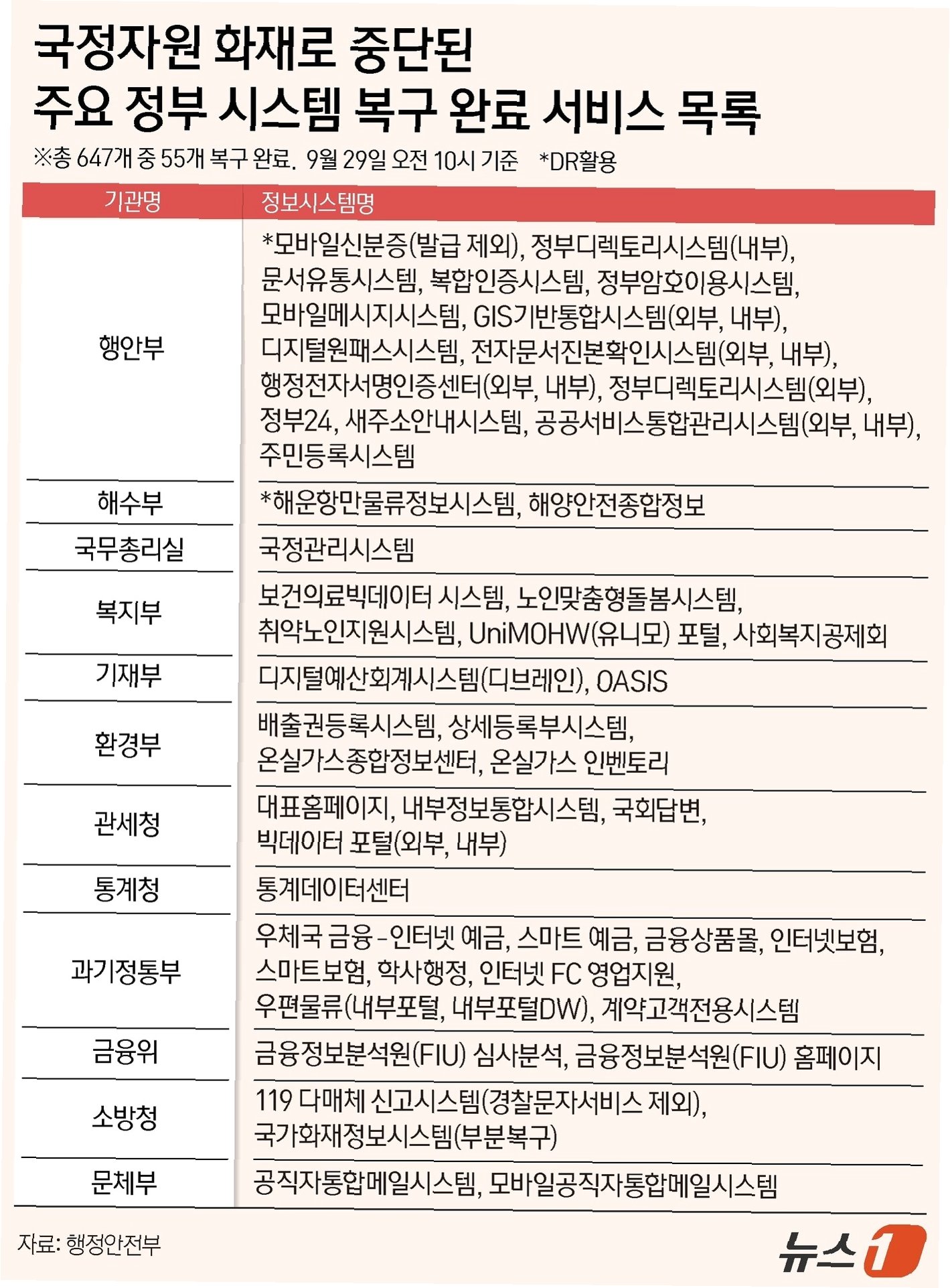 국가정보자원관리원(국정자원) 대전센터 화재로 인해 멈췄던 정부 행정정보시스템들이 속속 복구되고 있습니다. 중앙재난안전대책본부의 발표에 따르면, 29일 오전 10시 기준 총 647개 시스템 중 55개가 복구되었습니다. 이는 국민들의 불편을 최소화하기 위한 정부의 노력을 보여주는 중요한 지표입니다.