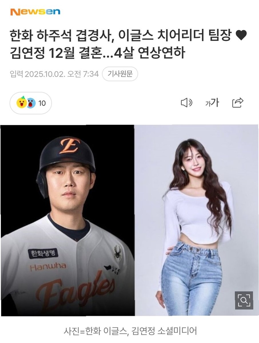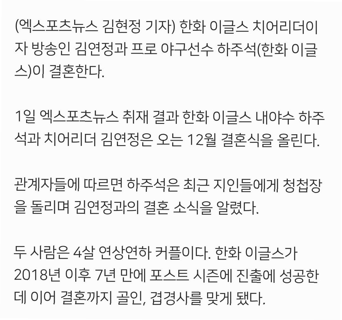 한화 이글스, 겹경사 맞이하다: 하주석 선수와 김연정 치어리더의 로맨틱한 결혼