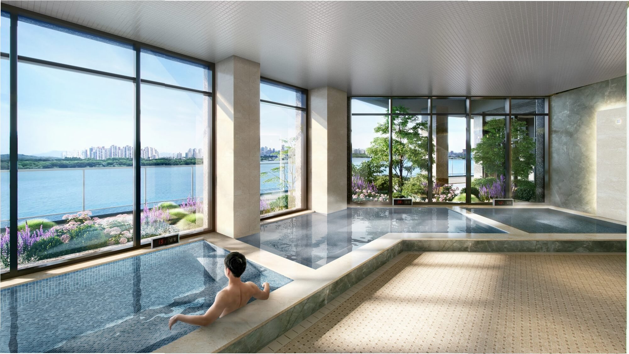 지하 1층의 커뮤니티 시설은 단 128가구만을 위해 마련된 약 1000평 규모의 공간입니다. 한강을 마주한 실내 수영장, 호텔식 사우나, 스크린골프장, 시네마룸 등 5성급 호텔 멤버십을 연상시키는 시설을 갖추고 있습니다. 특히, 사우나 내 파우더룸과 샤워실은 개인만 사용할 수 있도록 설계되어 '프라이빗'이라는 키워드를 강조합니다. 예약제로 운영되는 시네마룸은 맞춤형 고급 사운드 시스템을 갖추고 있어 입주민들에게 특별한 경험을 선사합니다.