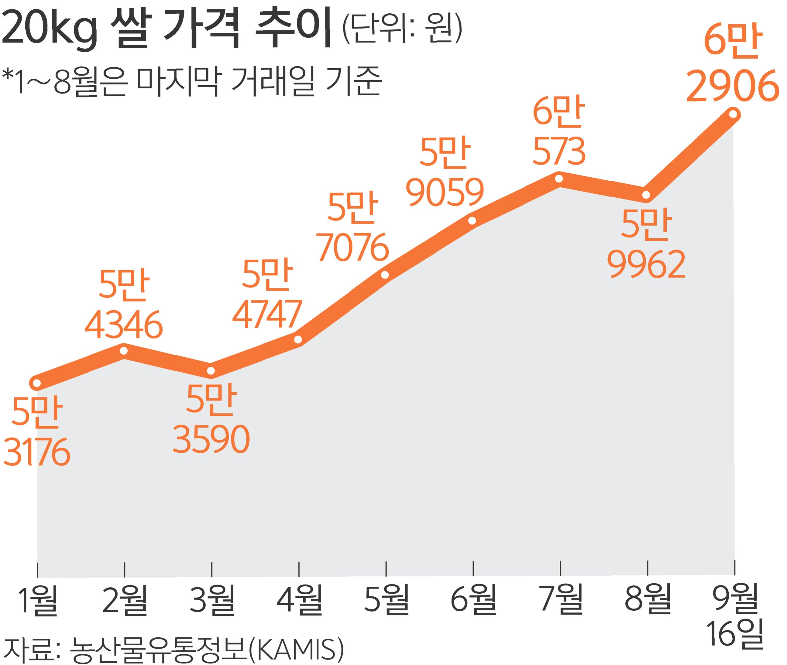 정부는 지난해 가을 쌀값 하락을 막기 위해 비축 물량 36만t에 더해 26만2000t의 쌀을 ‘시장격리’ 물량으로 더 사들였다. 지난해 쌀 초과 생산량은 5만6000t 수준인데 쌀값 상승을 위해 20만t을 더 매입했다. 시장 재고가 부족해지며 올해 3월부터 쌀값이 오르기 시작했지만, 정부는 양곡 방출을 미루다 8월 말이 되어서야 쌀을 풀기 시작했다.
