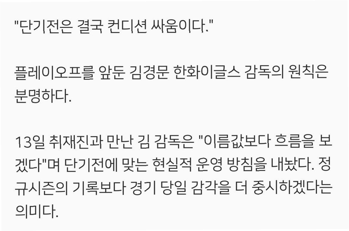 김경문 한화이글스 감독은 플레이오프를 앞두고 '단기전은 결국 컨디션 싸움이다'라고 강조하며, 현실적인 운영 방침을 밝혔다. 그는 정규시즌 기록보다 경기 당일의 감각을 더 중요하게 생각하며, 선수들의 컨디션 관리에 집중하고 있다.