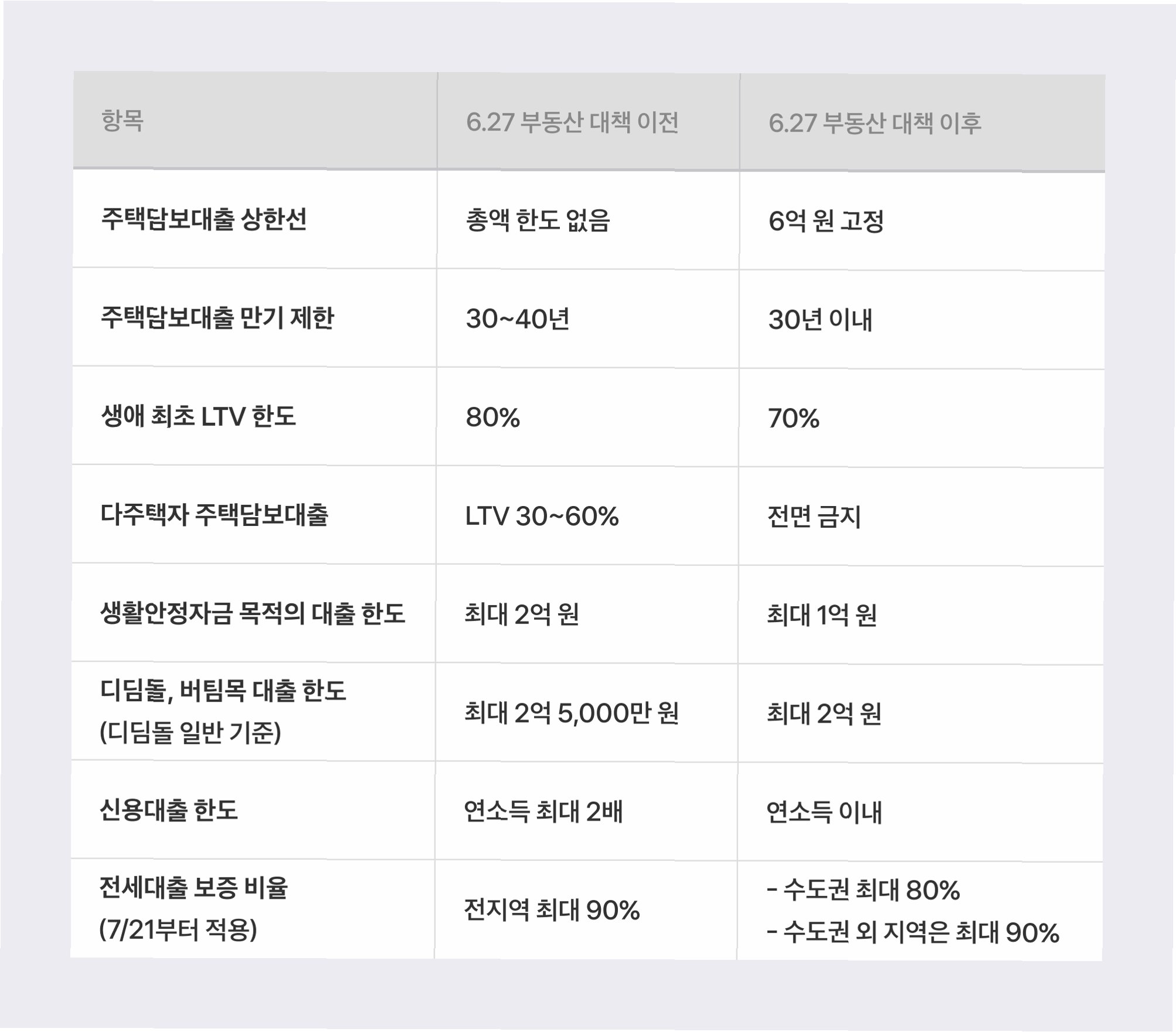 A.주택담보대출 한도가 집값에 따라 차등 적용되며, 주택담보대출 스트레스 금리가 인상되었습니다. 또한, 전세대출에도 DSR 규제가 적용됩니다.