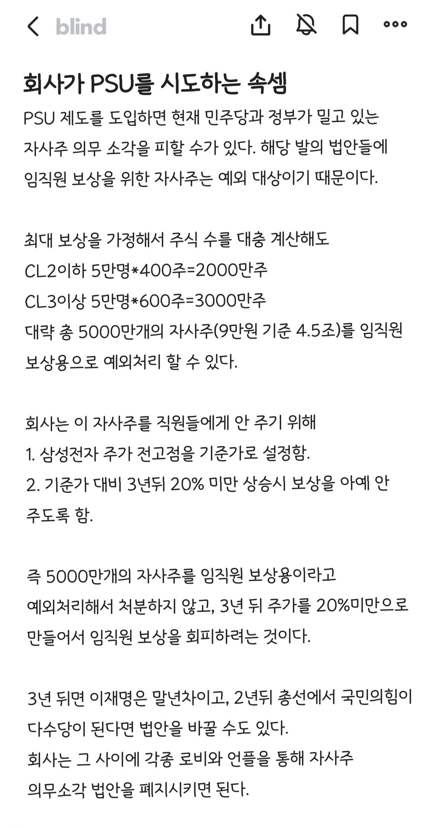 A.전혀 사실이 아닙니다. 삼성전자는 자사주 매입 후 소각과 임직원 보상용을 명확히 구분하여 공시했습니다. PSU는 임직원 보상을 위한 별도의 제도이며, 자사주 소각과는 무관합니다.