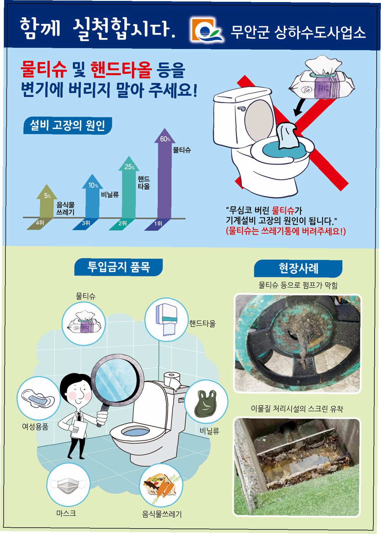 공용 화장실에서 흔히 볼 수 있는 경고 문구, 바로 ‘변기에 물티슈를 넣지 마세요.’입니다. 플라스틱 성분으로 만들어진 물티슈는 변기에 버려질 경우 하수관 막힘의 주범이 됩니다. 이는 하수 처리 시설의 고장으로 이어져 막대한 사회적 비용을 초래합니다. 우리도 모르는 사이, 물티슈가 당신의 일상을 불편하게 만들 수 있다는 사실, 인지하고 계셨나요?