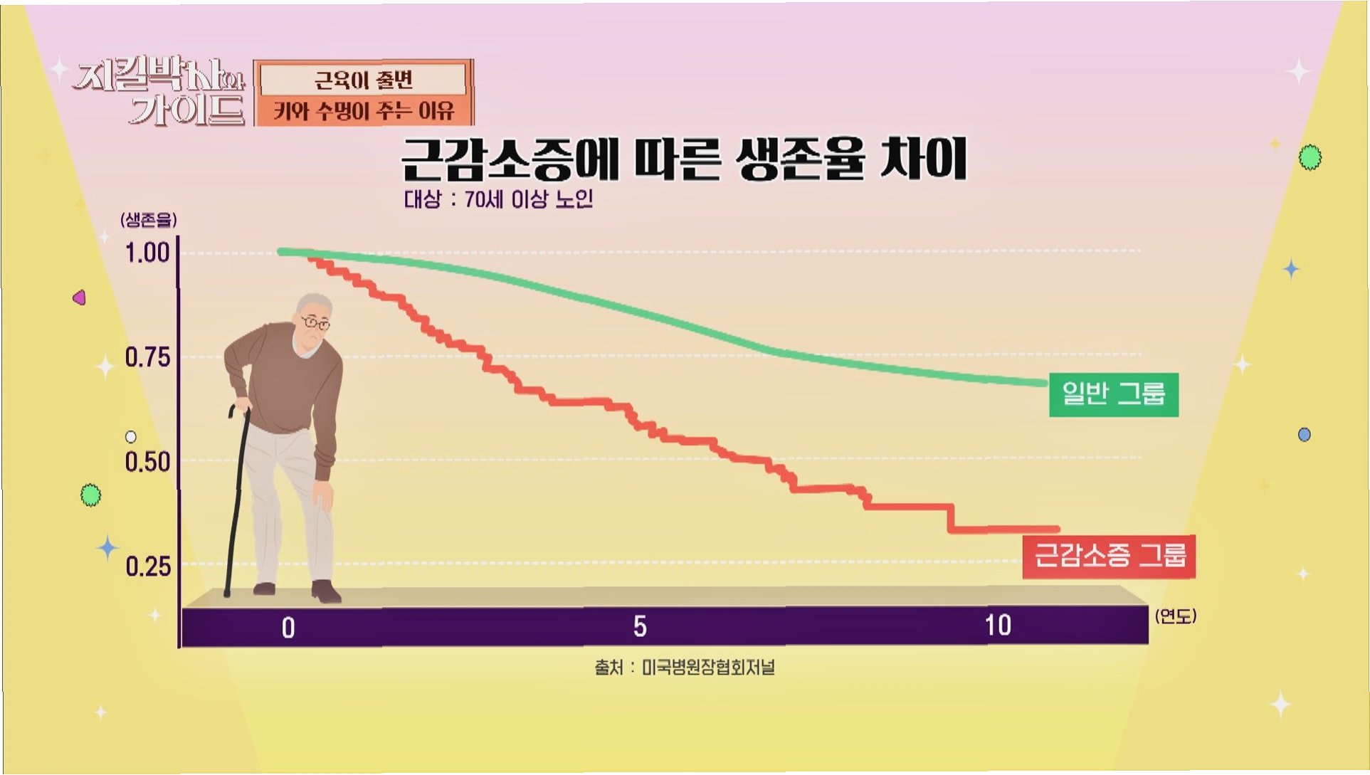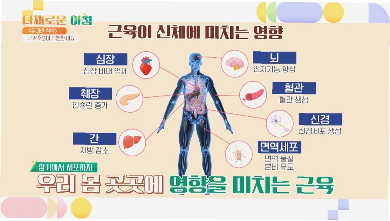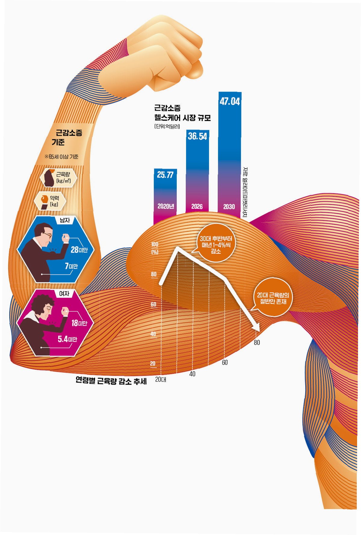우리 몸의 근육량은 20~30대에 최고치에 이릅니다하지만 40대 이후부터는 해마다 약 1%씩 근육이 빠져나갑니다. 그러다 80대가 되면 최고치의 40~50%까지 근육이 감소합니다. 공식 질병으로 등록된 근감소증은 다른 질병과의 연관성도 큽니다. 여러 연구 결과를 종합하면 근감소증은 낙상으로 인한 골절의 위험을 3배 이상 증가시킵니다. 대사증후군 위험은 2.6배, 심혈관질환 위험은 2.3배 높입니다. 또 근감소증 환자는 일반인보다 사망 위험이 3.7배 높다는 연구 결과도 있습니다. 근육이 노년기의 삶을 편안하게 하느냐, 고통스럽게 하느냐를 좌우한다고 말할 수 있습니다.