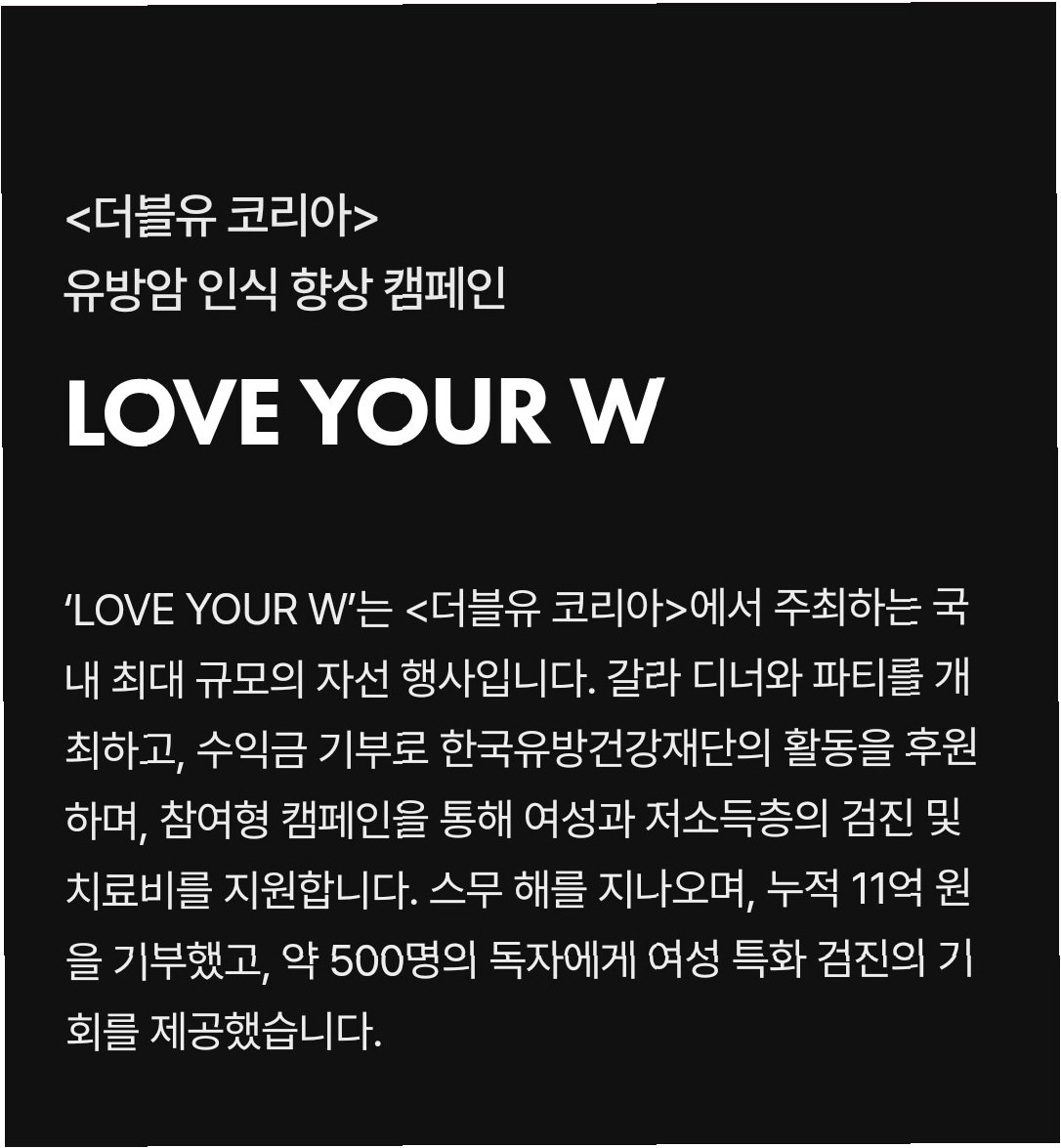 A.W코리아는 2006년부터 2025년까지 유방암 인식 향상 캠페인을 통해 총 11억 원을 기부했습니다.