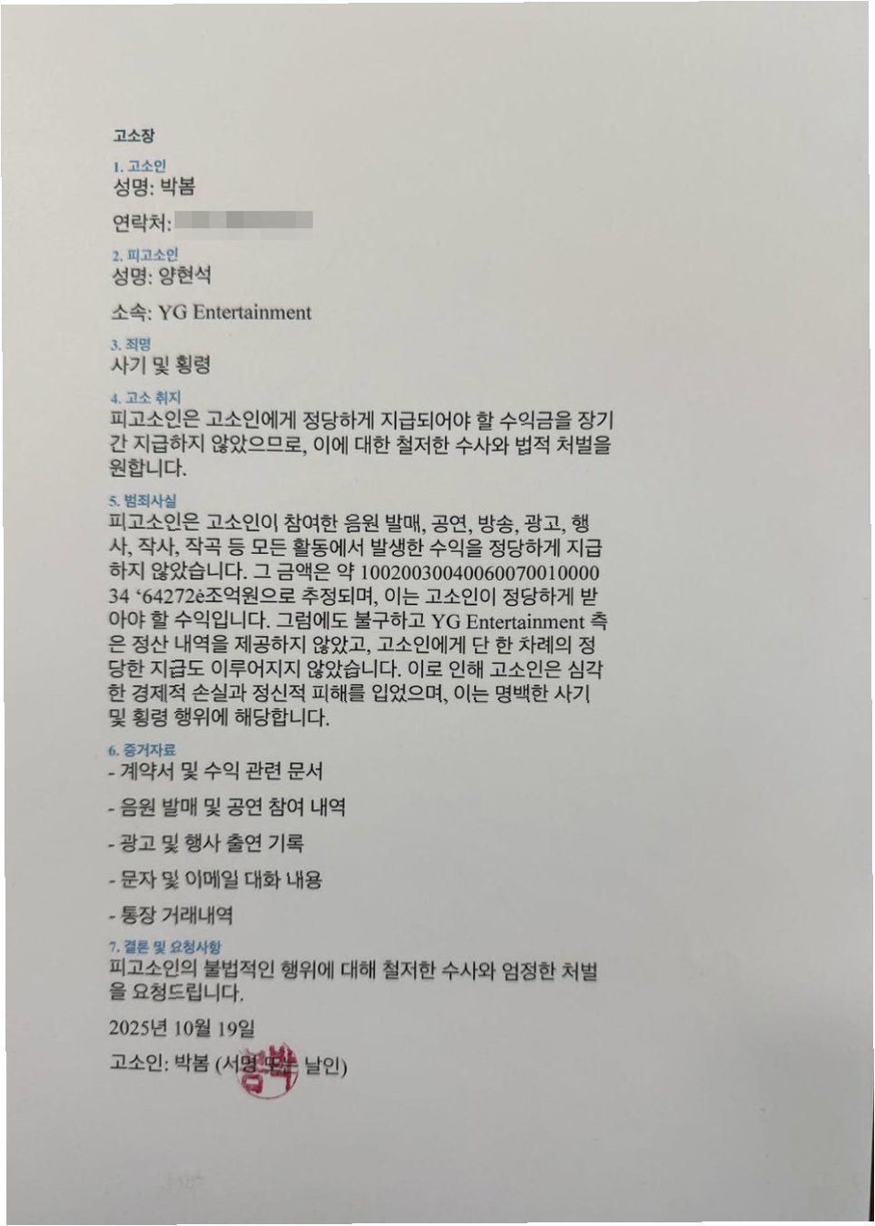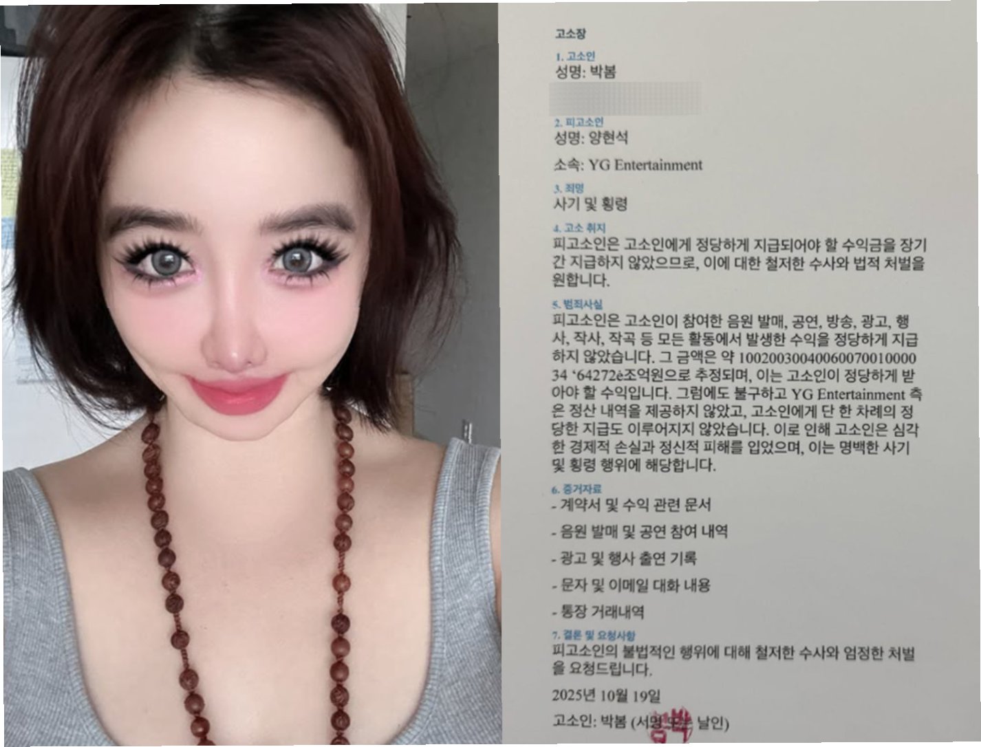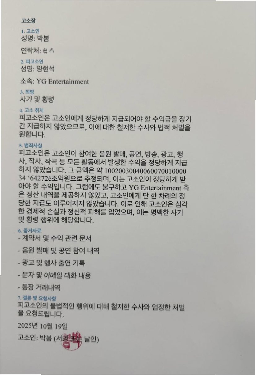 가수 박봄이 양현석 YG엔터테인먼트 총괄 프로듀서를 고소했다는 소식이 전해지며 연예계가 술렁이고 있습니다. 박봄은 자신의 SNS를 통해 고소 사실을 공개하며, 팬들과 대중에게 충격을 안겨주었습니다. 특히, 박봄이 공개한 고소장 내용에는 양현석을 사기 및 횡령 혐의로 고소했다는 내용이 담겨 있어 더욱 파장이 커지고 있습니다.
