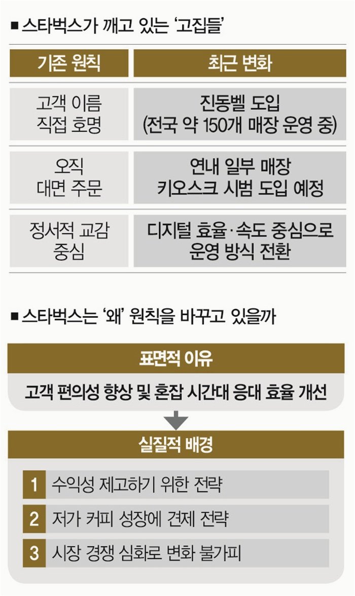 스타벅스는 '진동벨'을 도입하고, 키오스크를 확대하며 효율성을 높이는 데 집중하고 있습니다. 그동안 바리스타가 직접 고객의 이름을 부르며 소통하는 방침을 고수했지만, 이제는 주문 속도를 높이기 위해 키오스크를 도입하고 있습니다. 이러한 변화는 점심시간 혼잡을 완화하고, 더 많은 고객을 효율적으로 수용하기 위한 전략으로 해석됩니다. 이러한 변화는 스타벅스가 '커피가 아닌 문화를 판다'는 기존의 슬로건과는 다른 방향성을 보여주는 것으로 해석될 수 있습니다.
