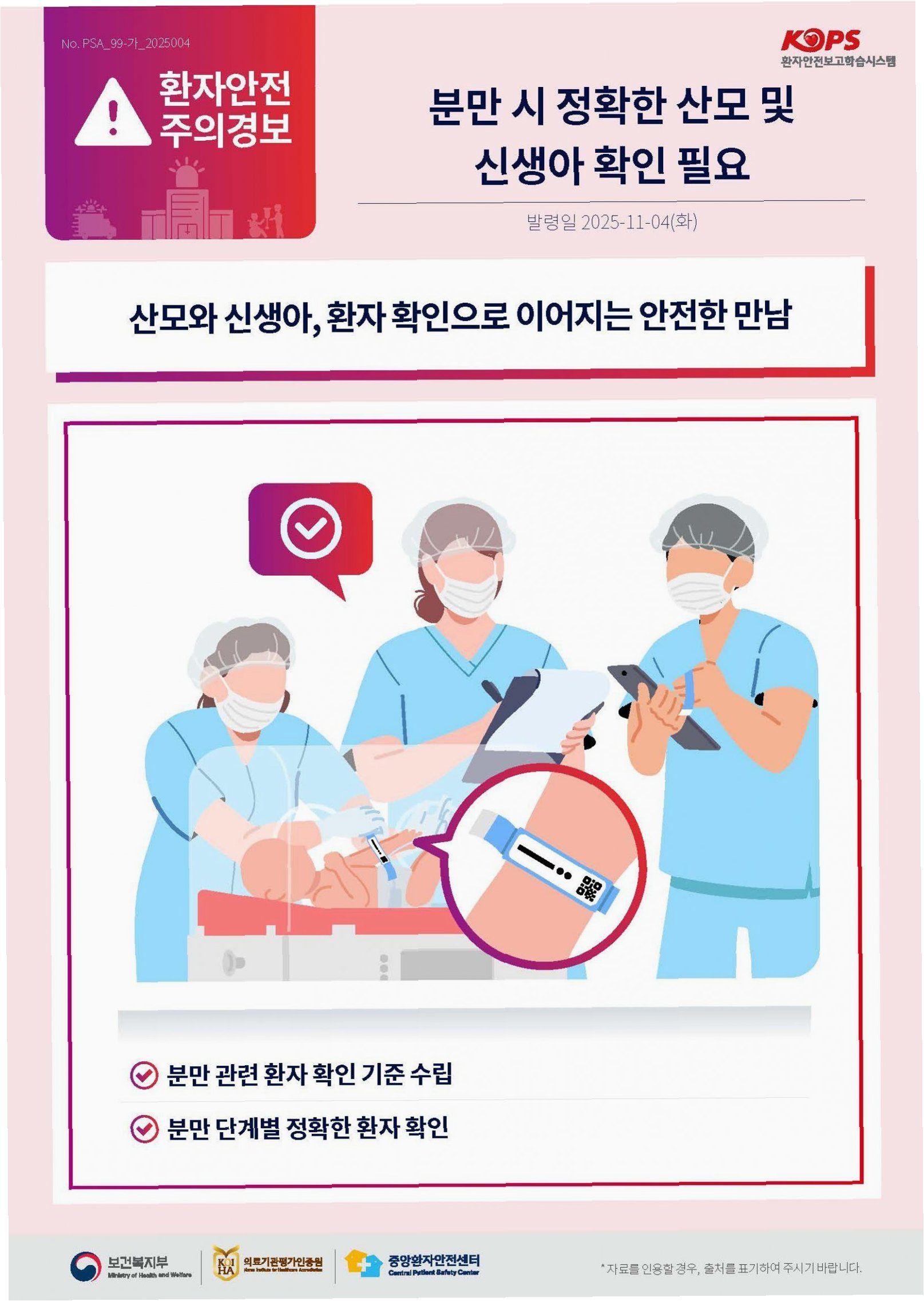 A.분만 단계별로 산모와 신생아를 정확하게 확인하는 체계적인 시스템 구축과 의료진의 철저한 확인, 안전 의식 함양이 중요합니다.