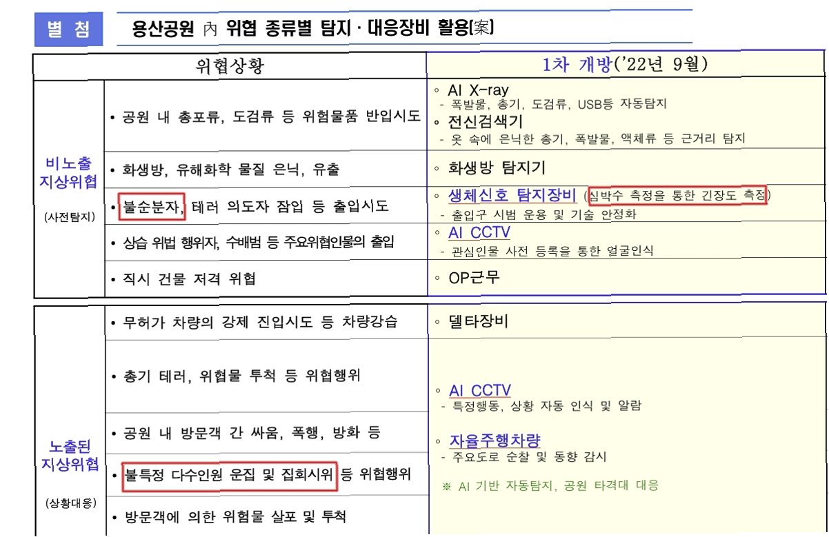 경호처가 작성한 내부 문건에 따르면, 용산공원 출입구에 심박수 측정 장비를 설치하여 시민들의 긴장도를 측정하려는 계획이 있었습니다. 이 장비는 '불순분자'를 가려내기 위한 목적으로 언급되었으며, 집회 시위 등 정권에 비판적인 세력을 감시하려는 의도로 해석될 수 있습니다. 이러한 시도는 2022년 6월 21일에 작성된 'AI 과학경호·경비 플랫폼 구축사업(1단계) 추진계획' 문건에 명시되어 있으며, AI 감시장비, 로봇견, 무인경비 차량 등의 도입을 포함하는 대규모 계획의 일환이었습니다. 이러한 첨단 감시 시스템 구축은 용산공원을 단순히 시민들이 휴식을 취하는 공간이 아닌, 감시와 통제의 대상으로 만들 수 있다는 우려를 자아냅니다. 특히 '불순분자'라는 표현은 과거 군사정권 시절 정권에 저항하는 시민들을 적대시할 때 사용되던 용어라는 점에서, 더욱 심각한 문제로 인식되고 있습니다.