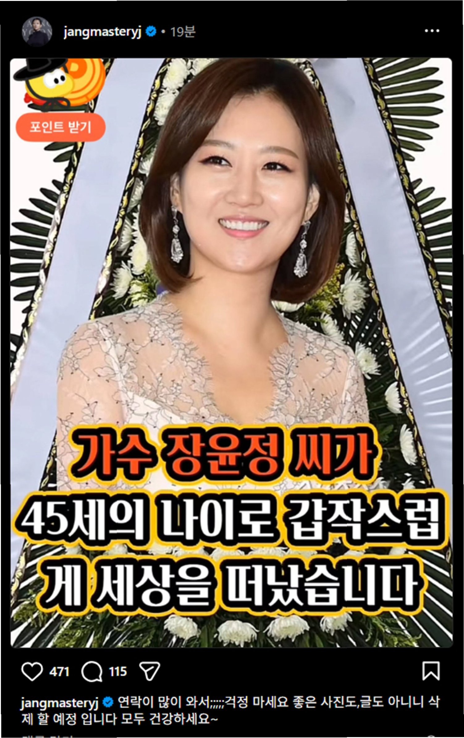 가수 장윤정이 '사망' 가짜 뉴스에 휩싸여 팬들의 걱정을 자아냈습니다. 장윤정은 자신의 인스타그램을 통해 직접 해명하며 팬들을 안심시켰습니다. 그녀는 '연락이 많이 와서. 걱정하지 마세요.'라는 메시지와 함께, 가짜 뉴스 캡처 사진을 공개했습니다. 이 사진에는 '가수 장윤정 씨가 45세의 나이로 갑작스럽게 세상을 떠났다'는 충격적인 내용이 담겨 있었습니다. 이에 남편 도경완은 '이런 XX들'이라며 분노를 표출했고, 동료 연예인 신지도 '짜증나네 진짜'라는 댓글을 남기며 함께 분노했습니다. 이번 사건은 연예인들을 괴롭히는 악성 가짜 뉴스의 심각성을 다시 한번 보여주는 사례입니다.