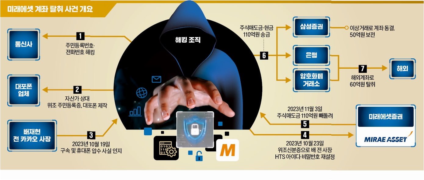 국내 자기자본 1위 증권사인 미래에셋증권에서 계좌 소유자가 알지 못하는 사이 수십억 원 규모의 주식과 현금이 다른 계좌로 빠져나가는 사건이 발생했습니다배재현 전 카카오 투자총괄대표(사장)는 2023년에 발생한 이 해킹 사건과 관련하여 100억 원대 피해를 주장하며 미래에셋증권에 소송을 제기했습니다. 이 사건은 단순한 금융 사고를 넘어, 개인 정보 유출과 주식 시장의 취약성을 드러내는 중요한 사례로 부각되고 있습니다.