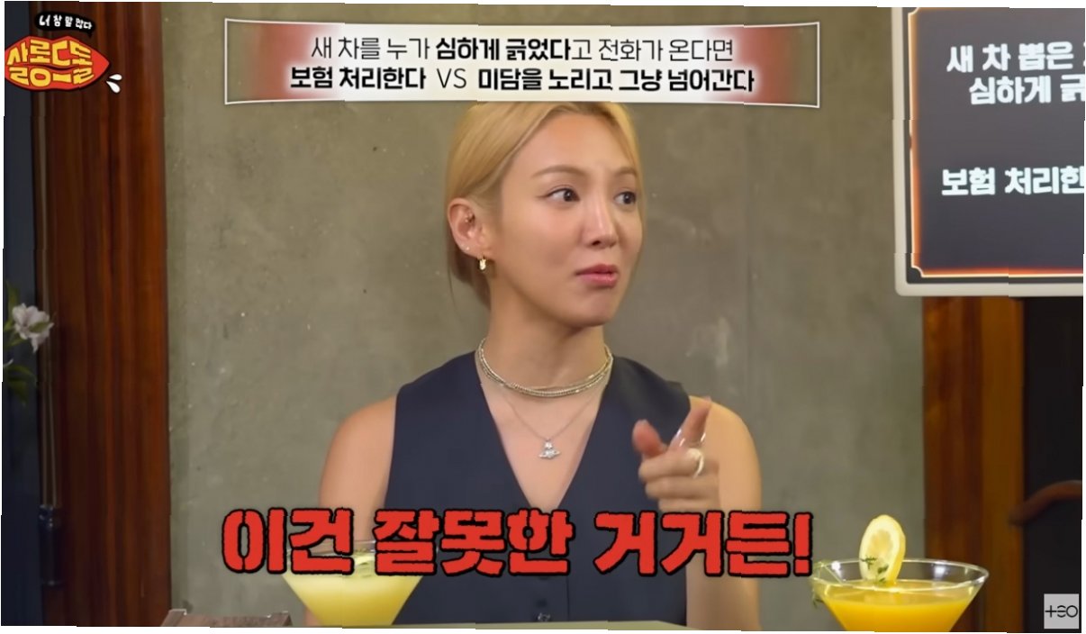 효연은 '새 차를 긁었을 때'라는 상황에 대해 '봐주는 게 미담으로 될 수도 있는 거구나'라고 말하며, 연예인에게 쏟아지는 미담 강요에 대한 생각을 밝혔습니다. 그녀는 '저런 게 자꾸 올라와서 이런 게 미담이 되는 거다. 저건 잘못한 거다'라고 지적하며, 연예인에게 긍정적인 이미지를 강요하는 사회적 분위기에 대해 비판적인 입장을 보였습니다. 효연은 '누가 내 사이드 미러 치고 지나가도 '연예인이니까 봐줘야 하나보다'라는 분위기로 흘러간다니까'라고 말하며, 연예인으로서 겪는 고충을 토로했습니다.