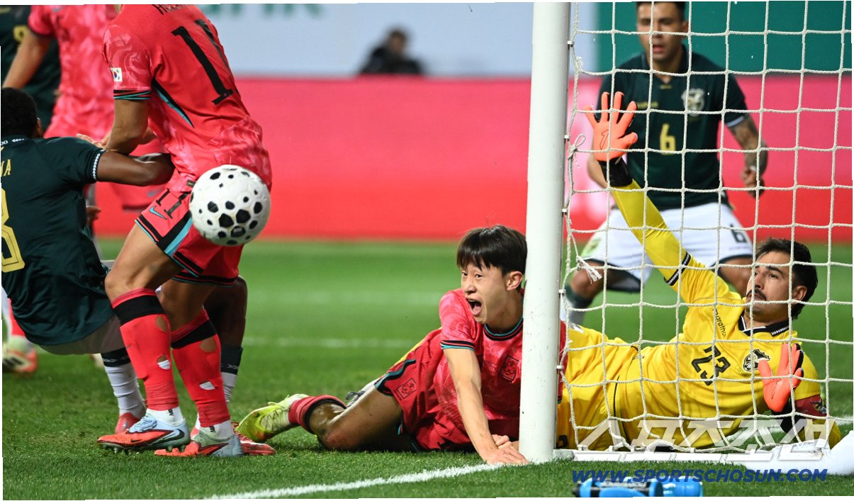 전반 10분, 손흥민의 코너킥이 낮게 떨어지자 이재성은 몸을 던져 헤더를 시도했습니다. 볼리비아 골키퍼 기예르모 비스카라의 선방으로 공이 흘러나오자, 이재성은 공을 골문 안으로 밀어 넣기 위해 다시 한번 머리를 내밀었습니다. 바로 그 순간, 비스카라는 재빨리 손을 뻗어 이재성의 머리를 밀어내는 듯한 장면을 연출하며, 위험한 상황을 막았습니다. 동시에 골대로 흐르던 공은 발로 걷어내며, 완벽한 판단력을 보여주었습니다.