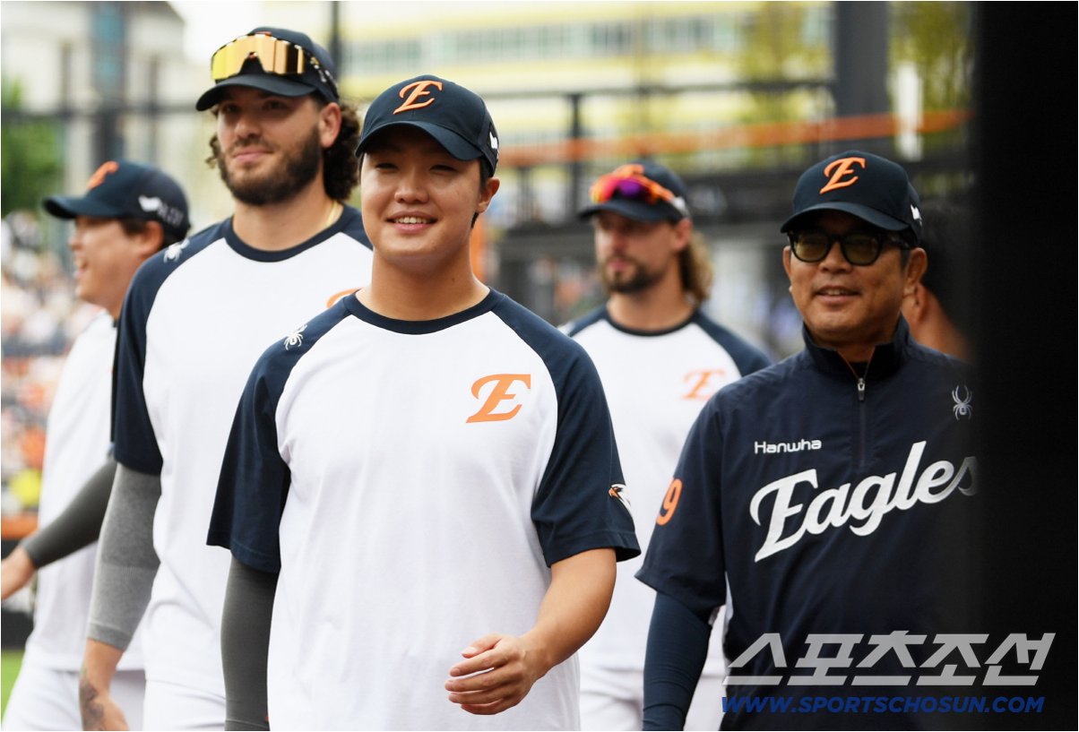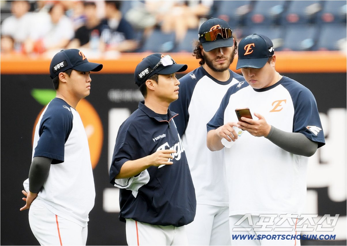 폰세는 정우주의 선발 등판을 알리는 트윗을 인용하며 '굿 럭(Good Luck)! lil brother!(동생)'이라고 응원 메시지를 보냈습니다. 그는 또한 최재훈과의 배터리 조합을 보며 행복해하는 모습을 보였습니다.