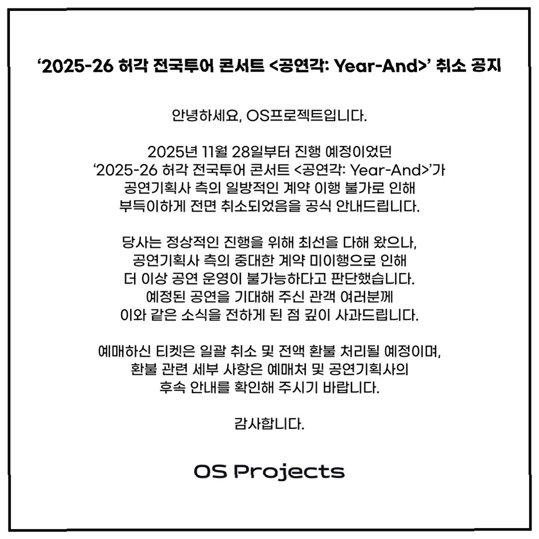 허각과 임한별은 공연 기획사의 계약 미이행으로 인해 예정되었던 연말 콘서트를 취소하게 되었습니다. 허각의 소속사는 “11월 28일부터 진행예정이었던 ‘2025-2026 허각 전국투어 ‘공연각: 이어-앤드’’가 공연기획사 측의 일방적인 계약 이행 불가로 부득이하게 전면 취소 됐다”고 밝혔습니다. 임한별 역시 같은 이유로 12월 20일부터 진행될 예정이었던 연말 콘서트 ‘크리스마스타’를 취소했습니다. 두 아티스트 모두 팬들에게 깊은 아쉬움을 전하며, 추후 더 좋은 모습으로 만날 것을 약속했습니다.