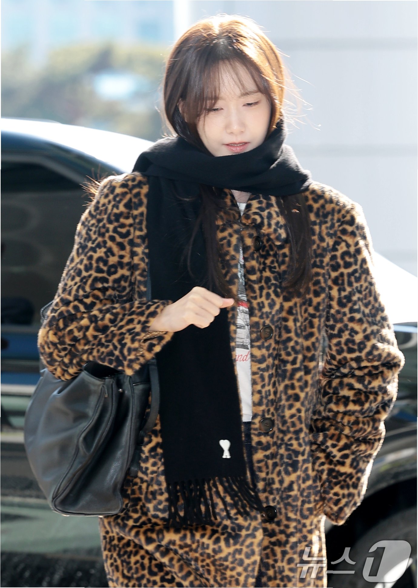 A.두툼한 레오파드 퍼 코트입니다. 윤아는 이 코트를 통해 겨울 분위기를 연출하고, 자신만의 스타일을 완성했습니다.