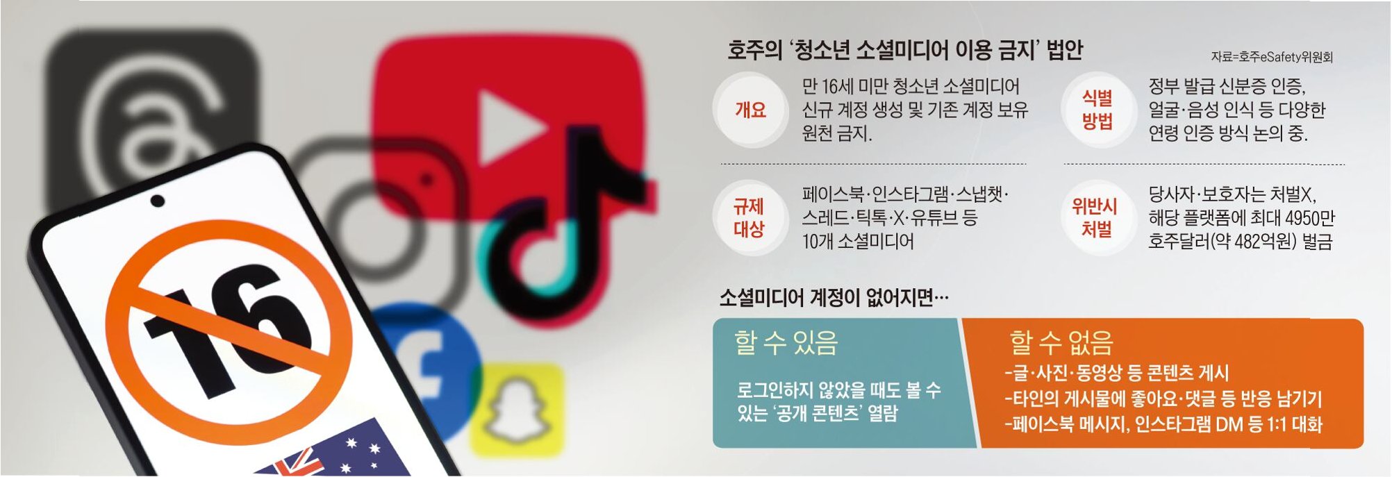 호주의 온라인안전법에 따르면 10일부터 소셜미디어 플랫폼은 16세 미만 청소년의 소셜 미디어 계정의 생성·유지를 막기 위한 합리적 조치를 입증해야 한다. 이를 어기면 플랫폼 사업자에게 최대 4950만 호주 달러(약 480억원)의 벌금이 부과된다.
