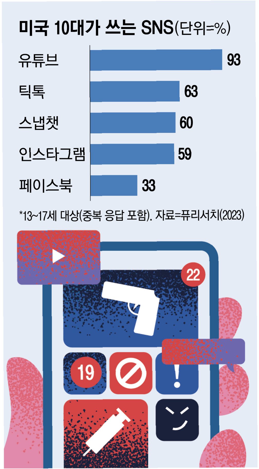 소셜미디어가 청소년의 정신건강에 끼치는 위해가 심각하다는 연구결과는 속속 나오고 있다. 미국 캘리포니아대학교 샌프란시스코(UCSF) 연구팀이 초등학교 고학년 학생들을 3년간 추적 관찰한 결과에 따르면 소셜미디어 사용 시간이 하루 평균 7분에서 73분으로 늘어날 때 우울 증상이 35% 늘어난 것으로 나타났다.