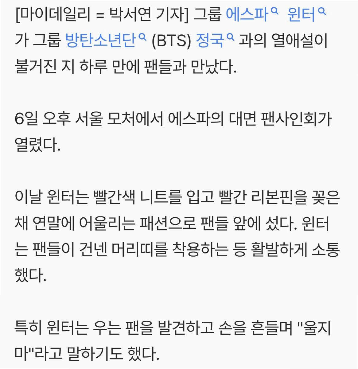 그룹 에스파 윈터가 그룹 방탄소년단(BTS) 정국과의 열애설이 불거진 지 하루 만에 팬들과 만났다. 6일 오후 서울 모처에서 에스파의 대면 팬사인회가 열렸다. 윈터는 팬들의 따뜻한 응원에 보답하며 팬들과 소통하는 시간을 가졌다.