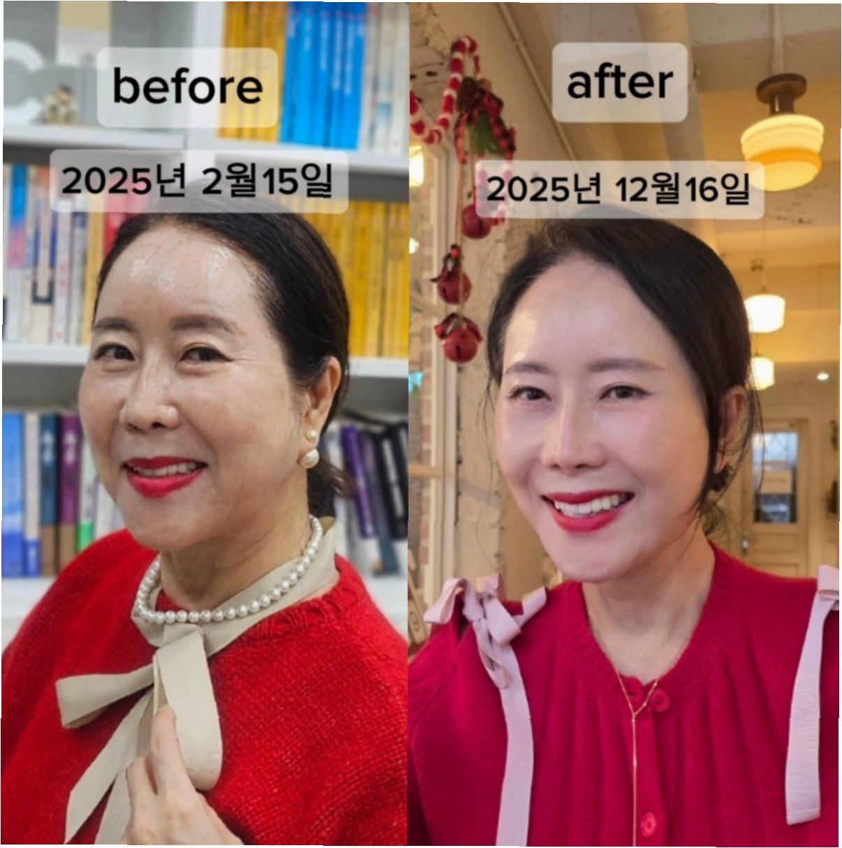 윤영미 씨는 자신의 관리 전후 모습을 비교하며, 확연히 달라진 외모를 공개했습니다. 갸름해진 얼굴선, 탄력 넘치는 피부, 팽팽해진 목선은 그녀의 노력을 여실히 보여주는 결과입니다. 특히, 2월과 12월의 사진을 통해 윤영미 씨가 얼마나 큰 변화를 이루었는지, 그 놀라운 변화를 직접 확인해 보시죠. 그녀의 변신은 많은 여성들에게 희망과 용기를 주고 있습니다.