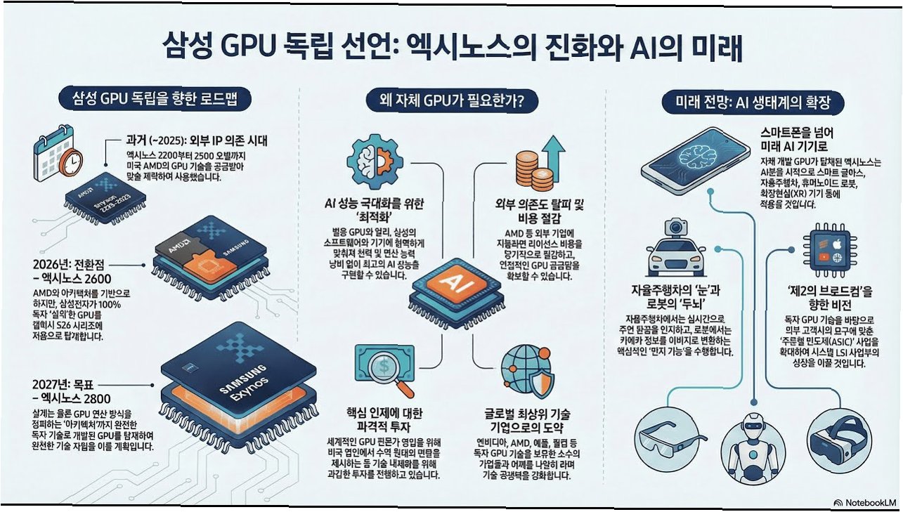 A.자체 GPU 개발은 기술 독립을 의미하며, AMD에 지불하던 로열티를 절감하여 비용을 줄이고, AI 시대 시스템 반도체 경쟁력을 강화하는 데 기여합니다. 또한, 삼성의 미래 경쟁력을 확보하는 핵심 동력이 됩니다.