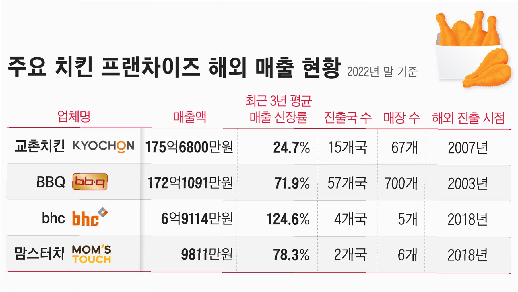 BBQ는 미국, 독일, 중국, 일본 등 57개국에서 매장을 운영하며 글로벌 시장을 공략하고 있습니다. bhc는 미국, 캐나다, 동남아시아 등 해외 8개국에서 39개 매장을 운영 중이며, 교촌치킨 역시 미국 등 해외에 80여 개 매장을 운영하고 있습니다. 치킨 프랜차이즈 업체들은 해외 진출을 통해 새로운 성장 동력을 찾고 있습니다.