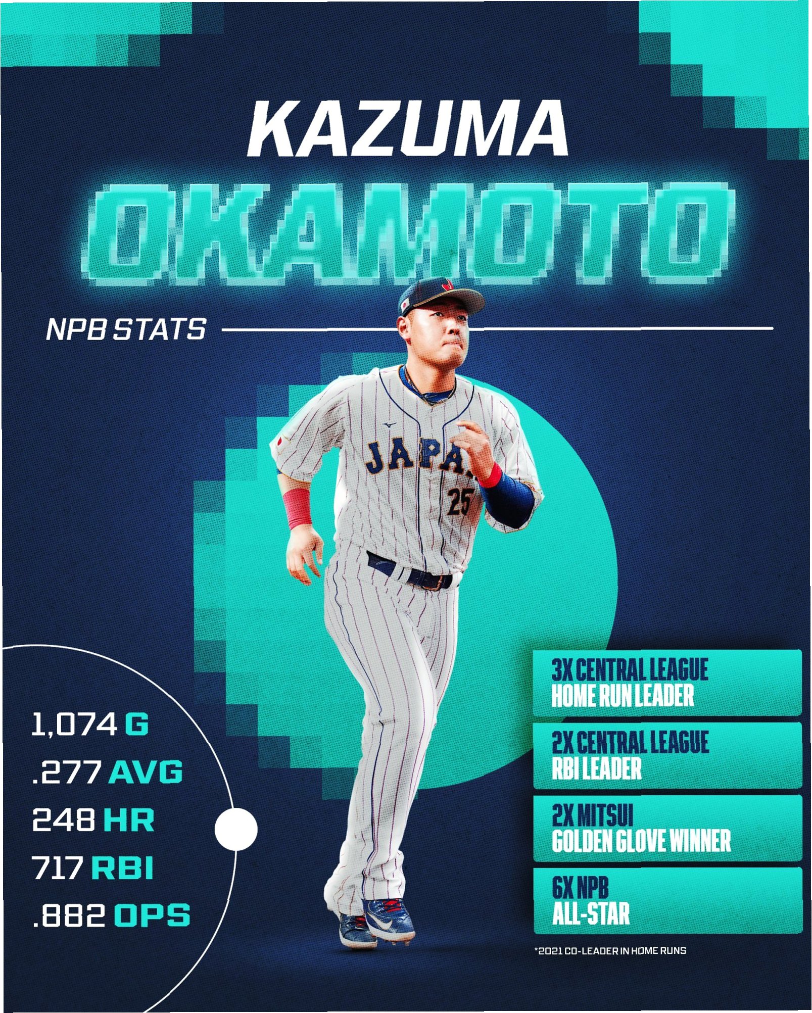 오카모토 카즈마는 NPB를 대표하는 거포로, 통산 1074경기에서 타율 0.273, 248홈런, 717타점을 기록했습니다. 특히 지난 시즌에는 부상에도 불구하고 타율 0.327, 15홈런, OPS 1.014를 기록하며 뛰어난 활약을 펼쳤습니다. 오카모토는 2023년 월드베이스볼클래식(WBC)에서도 일본 국가대표로 활약하며, 결승전에서 홈런을 기록하는 등 맹활약을 펼쳤습니다.