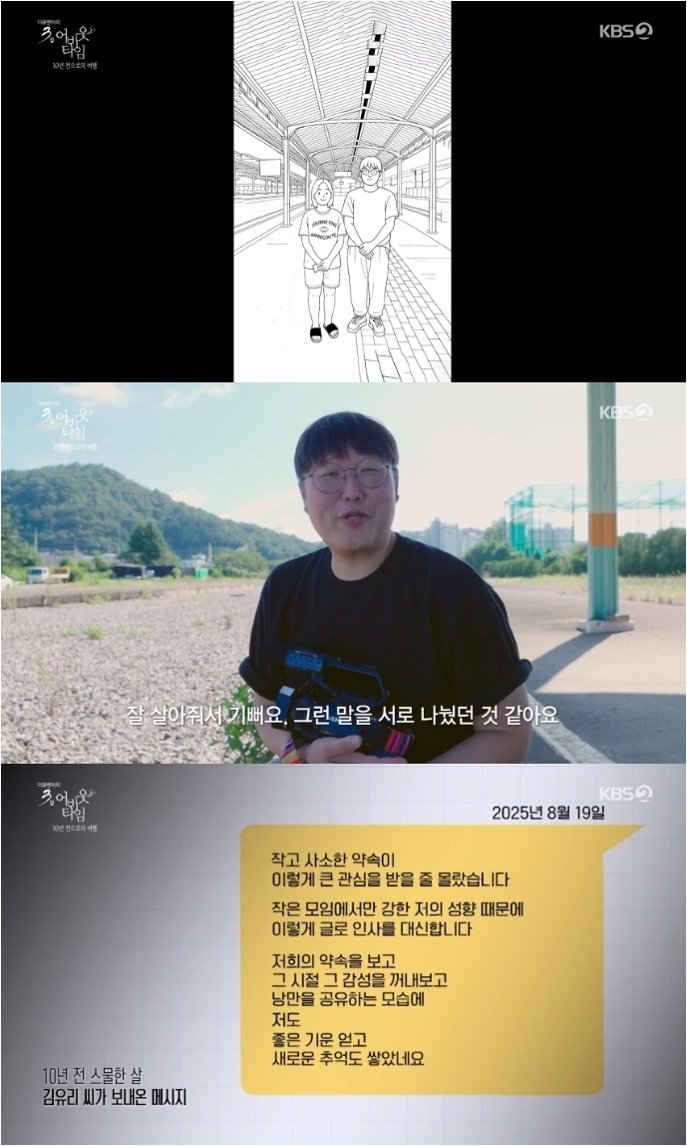 이지원 VJ는 김유리 씨와의 만남에서 “잘 살아줘서 고맙다, 그런 인사를 나눴다”며 감격스러운 마음을 표현했습니다. 10년 전의 사소한 약속이 시간이 흐르면서 더욱 특별한 의미를 갖게 되었고, 결국 낭만을 지켜낸 것에 대한 뿌듯함을 드러냈습니다. 김유리 씨는 “작은 약속이 이렇게 큰 관심을 받을 줄 몰랐다”며 제작진에게 감사의 마음을 전했습니다. 그녀는 담담하면서도 따뜻한 표정으로 10년 만의 재회를 받아들였고, 함께했던 시민들 또한 “작은 기적 같다”며 감동의 눈물을 흘렸습니다.