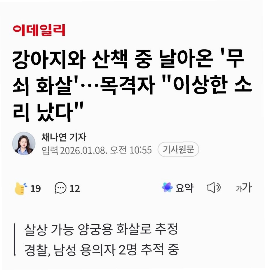 충북 청주에서 개와 산책 중이던 여성에게 끔찍한 사건이 발생했습니다지난 7일 밤 11시 40분쯤, 청주시 상당구 청소년광장에서 한 여성이 개와 산책을 하던 중, 정체불명의 화살이 날아드는 아찔한 사고가 벌어졌습니다. 신고를 받고 출동한 경찰은 현장 조사를 통해 사건의 실체를 파악하기 시작했습니다. 평화로운 밤, 갑작스러운 '이상한 소리'와 함께 날아온 화살은 산책 중이던 여성에게 큰 충격을 안겨주었습니다. 다행히 인명 피해는 없었지만, 자칫 큰 사고로 이어질 수 있었기에 더욱 충격적인 사건입니다.