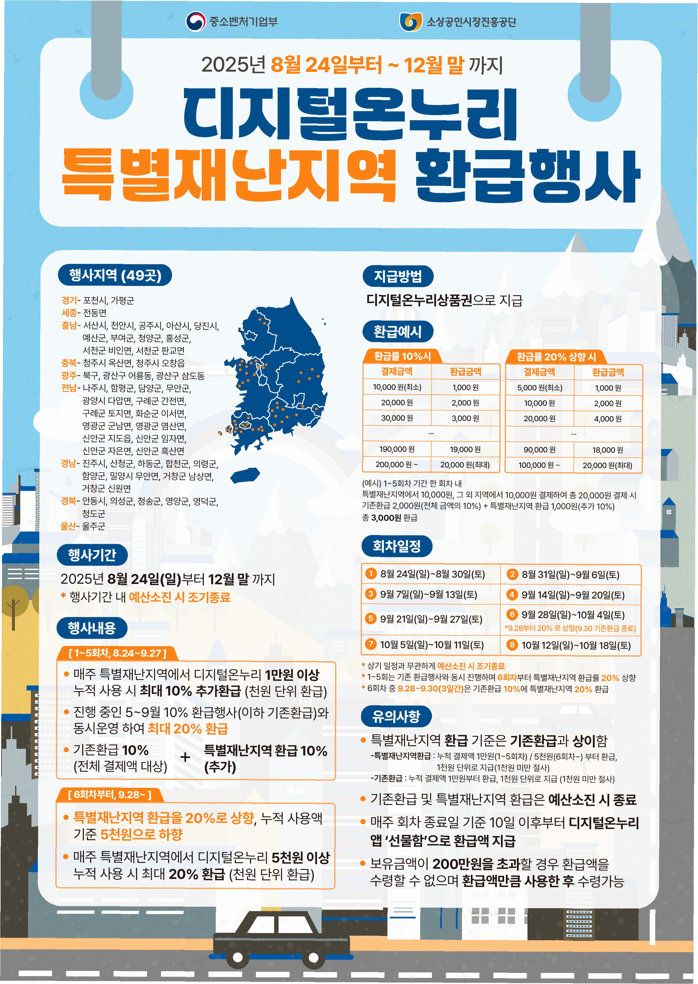 중소벤처기업부는 이달 24일부터 연말까지, 특별재난지역 49곳의 전통시장과 골목상권을 대상으로 디지털 온누리상품권 환급 행사를 진행합니다. 이는 지난달 경제관계장관회의에서 발표된 ‘지방 살리기 상생 소비 활성화 방안’의 일환으로, 침체된 지역 경제에 활력을 불어넣기 위한 중요한 발걸음입니다. 디지털 온누리상품권은 모바일과 카드 형태로 제공되며, 편리하게 사용할 수 있습니다.
