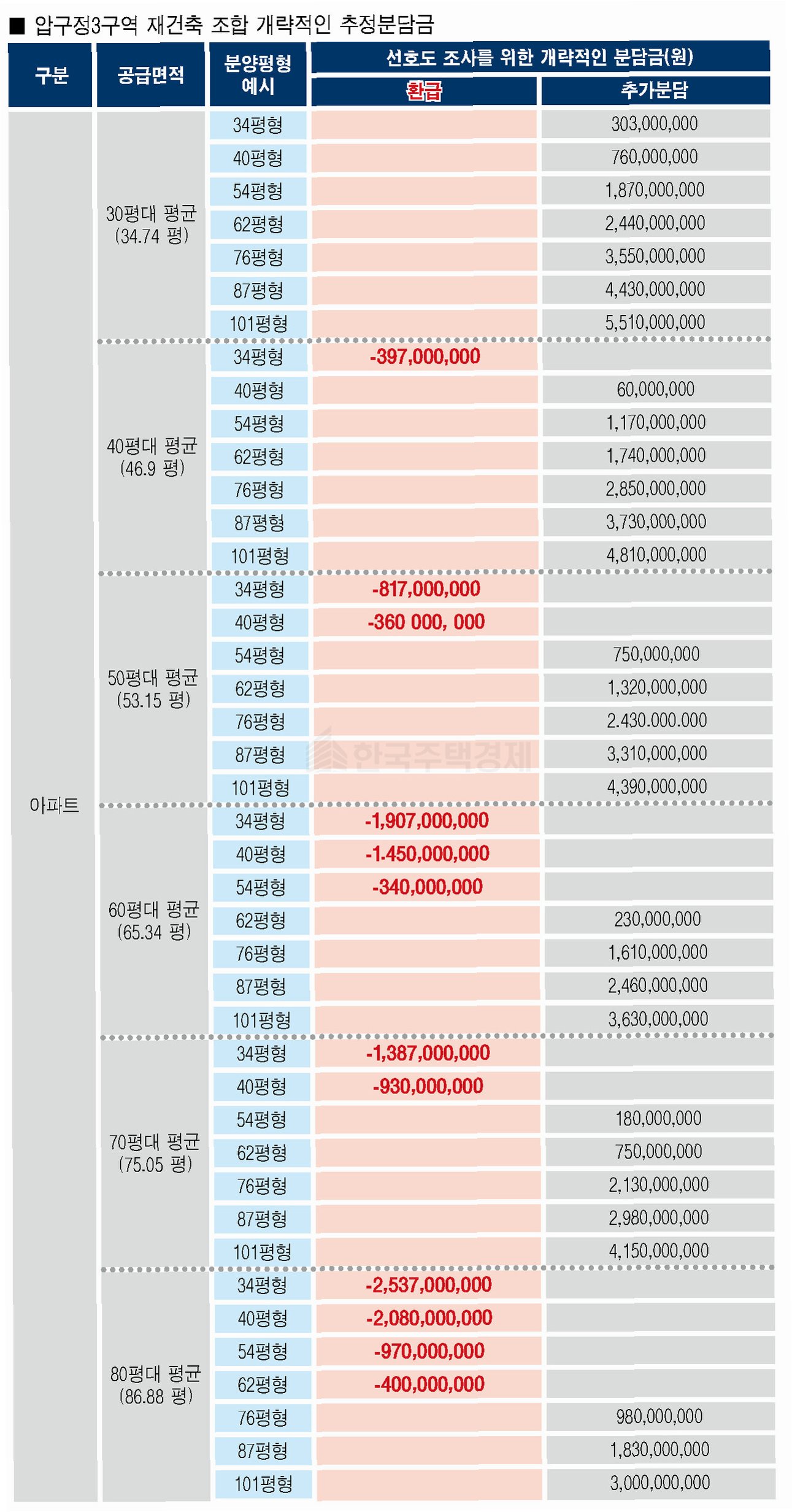 최근 정비업계에 따르면, 압구정4구역의 경우 30평대 아파트 조합원이 재건축 후 비슷한 평형대의 새 아파트를 분양받기 위해 최대 10억 원이 넘는 분담금을 내야 하는 상황입니다. 이는 압구정 재건축의 현실을 적나라하게 보여주는 지표입니다. 집 크기를 줄여도 10억 원이 넘는 분담금을 감당해야 할 수도 있습니다. 69평 조합원이 59평을 분양받더라도 분담금은 12억 5천만 원에 달합니다.