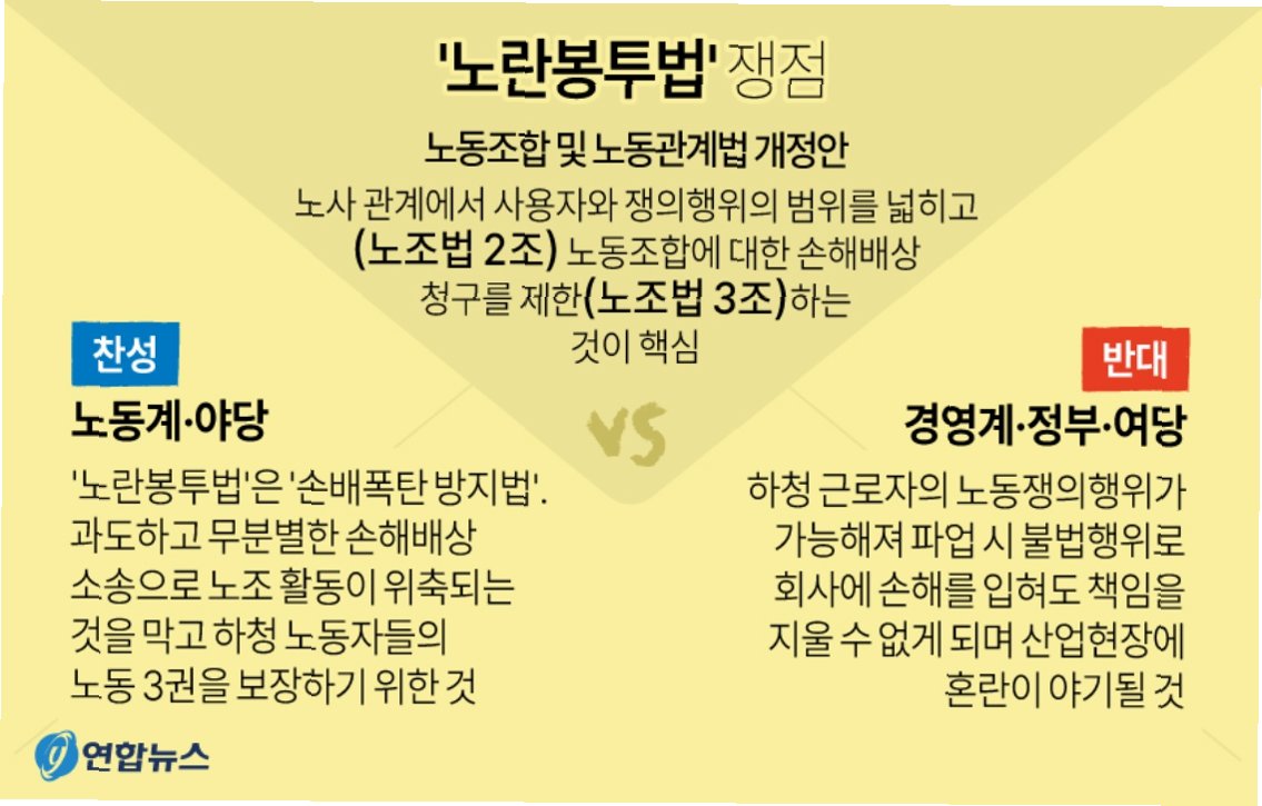 지난해 8월 국회에서 노동조합 및 노동관계조정법 일부개정법률안(대안)이 재석 186인, 찬성 183인, 반대 3인, 기권 0인으로 통과되었다는 사실은 노란봉투법 시행의 중요한 배경입니다고용노동부가 3월 시행을 앞둔 ‘노란봉투법’(노동조합법 2·3조 개정)은 하청 노동조합들이 서로 이해관계가 다를 때 원청 사업주에게 따로 교섭을 요구할 수 있도록 했습니다. 그동안 경영계가 ‘하청업체 노조 수백 곳과 직접 교섭해야 한다’며 어려움을 호소했지만 하청 노조의 손을 들어준 것입니다.