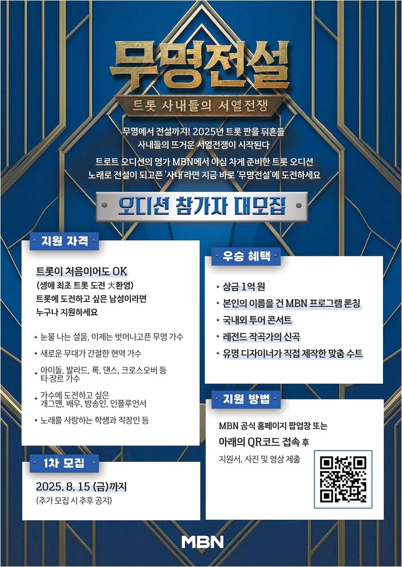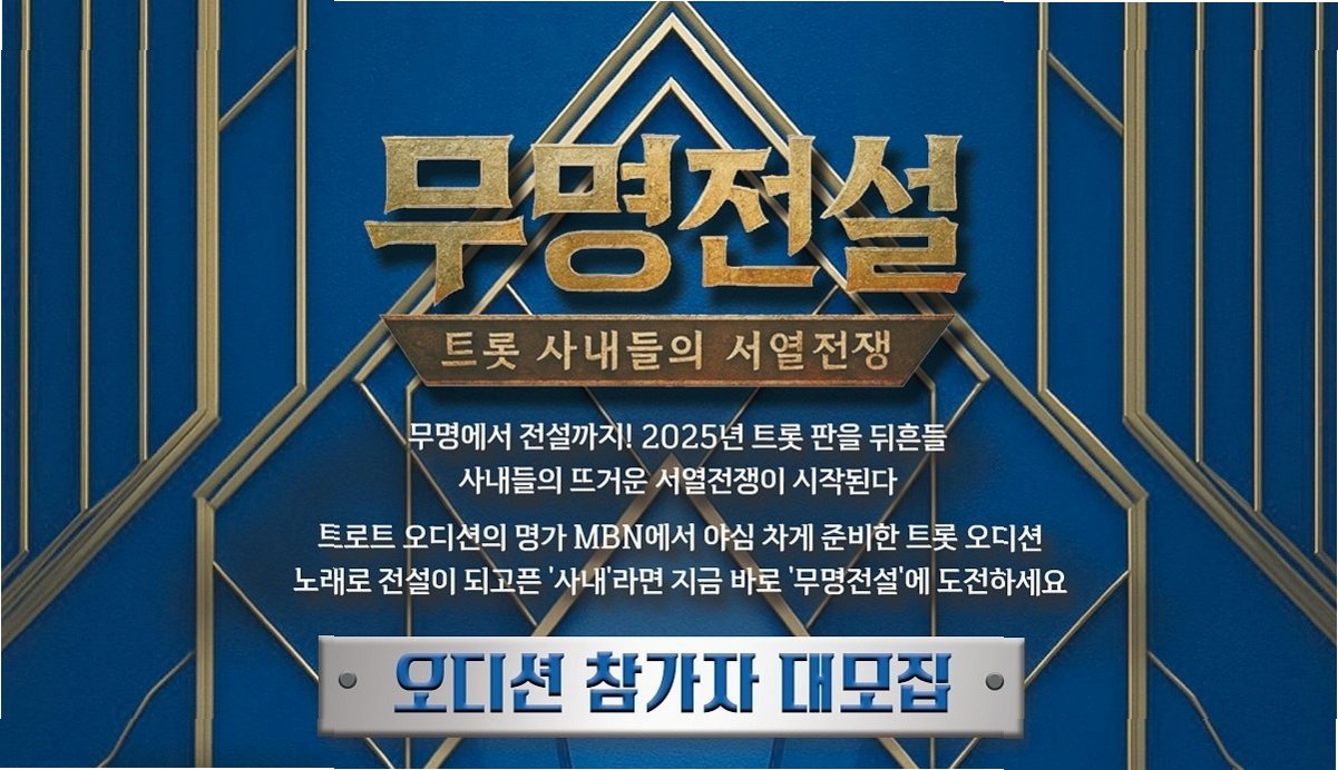 베일에 가려져 있던 프로그램 정보가 일부 공개되면서 '무명전설'을 향한 관심은 더욱 커지고 있습니다. 예상 밖의 유명 참가자 존재, 기존 트로트 오디션의 범주를 뛰어넘는 우승 특전 규모 등은 '무명전설'의 스케일을 짐작하게 합니다. 첫 방송 전부터 'MBN 표' 초대형 오디션 프로그램의 탄생을 예고하며, 트로트 팬들의 마음을 설레게 하고 있습니다. '무명전설'은 새로운 트로트 열풍을 일으킬 수 있을지, 많은 이들의 관심이 집중되고 있습니다.