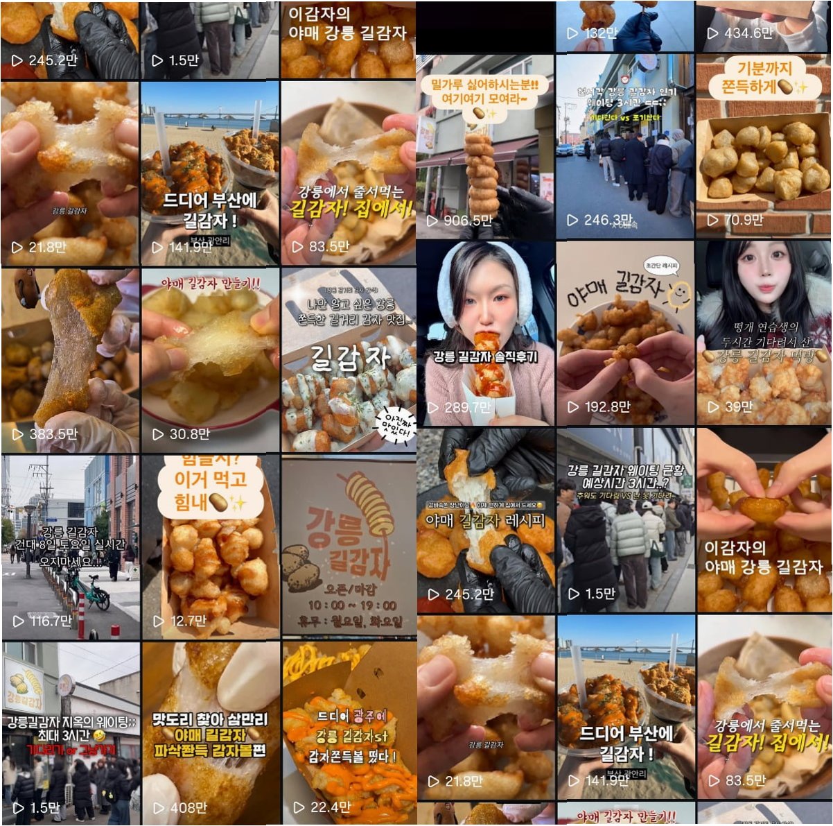 길감자는 SNS를 통해 빠르게 확산되며, 강릉을 방문하는 관광객들에게 필수 코스로 자리 잡았습니다. 유명 유튜버와 개그맨 박명수까지 길감자의 매력에 빠지면서, 그 인기는 더욱 뜨거워지고 있습니다. 이 같은 열기는 SNS를 통해 빠르게 확산됐다. 길감자는 숏폼 콘텐츠를 타고 입소문을 타며 강릉을 찾는 관광객 사이에서 필수 코스로 자리 잡았다. 인스타그램 릴스와 유튜브 쇼츠 등에는 길감자 방문기와 시식 후기 영상이 잇따라 올라왔고, 길감자 공식 홈페이지에 게시된 릴스 영상은 22일 기준 길감자 단일 메뉴 영상이 937만 회, 소시지 길감자 영상이 906만 회의 조회 수를 각각 기록했다.