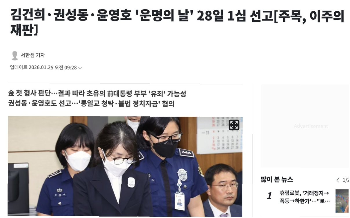 이번 주, 김건희 여사의 1심 선고가 예정되어 있어 세간의 이목이 집중되고 있습니다. 도이치모터스 주가 조작, 이른바 '명태균 게이트', 그리고 통일교 관련 금품 수수 혐의 등으로 재판을 받아온 김 여사에 대한 법원의 판단이 곧 내려질 예정입니다. 서울중앙지방법원 형사합의27부는 이번 주 28일 오후 2시 10분에 김건희 여사에 대한 1심 판결을 선고합니다앞서 결심 공판에서 검찰은 김 여사에게 징역 15년을 구형한 바 있어, 최종 판결에 대한 관심이 그 어느 때보다 높습니다. 이 판결은 단순한 개인의 법적 책임을 넘어, 우리 사회에 미칠 파장 또한 클 것으로 예상됩니다.