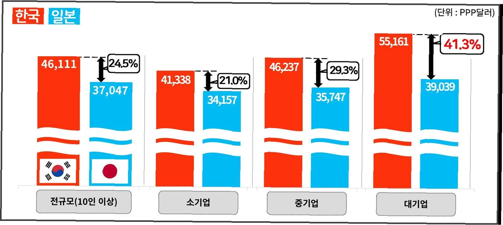 A.2024년 기준, 한국 대기업 대졸 초임은 일본 대기업보다 구매력평가(PPP) 기준 41.3% 높습니다.