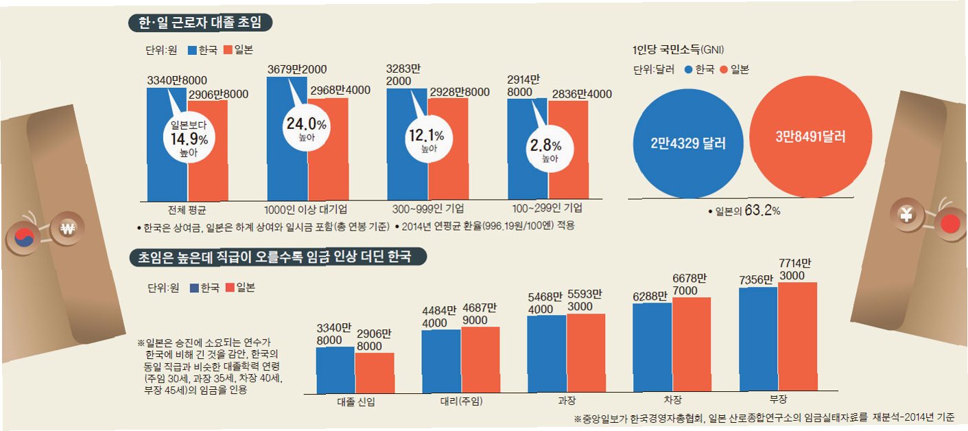 한국 대기업 대졸 초임, 일본보다 41% 높아