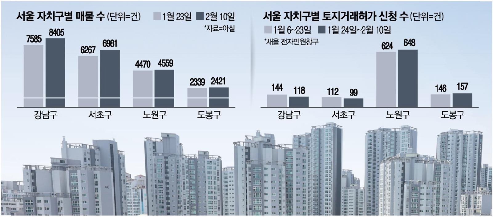 최근 매수세가 살아나던 서울 외곽 지역에서 오히려 매물이 늘어나는 현상이 나타나고 있습니다. 이는 매물이 소진되는 속도보다 새로운 매물이 시장에 나오는 속도가 더 빠르다는 것을 의미합니다. 노원구의 토지거래허가 신청 건수는 4% 증가했고, 도봉구는 7.5% 증가했습니다. 반면 강남구, 서초구, 성동구 등 한강벨트 지역은 토지거래허가 신청 건수가 오히려 감소하며 매수세가 꺾인 모습을 보였습니다.
