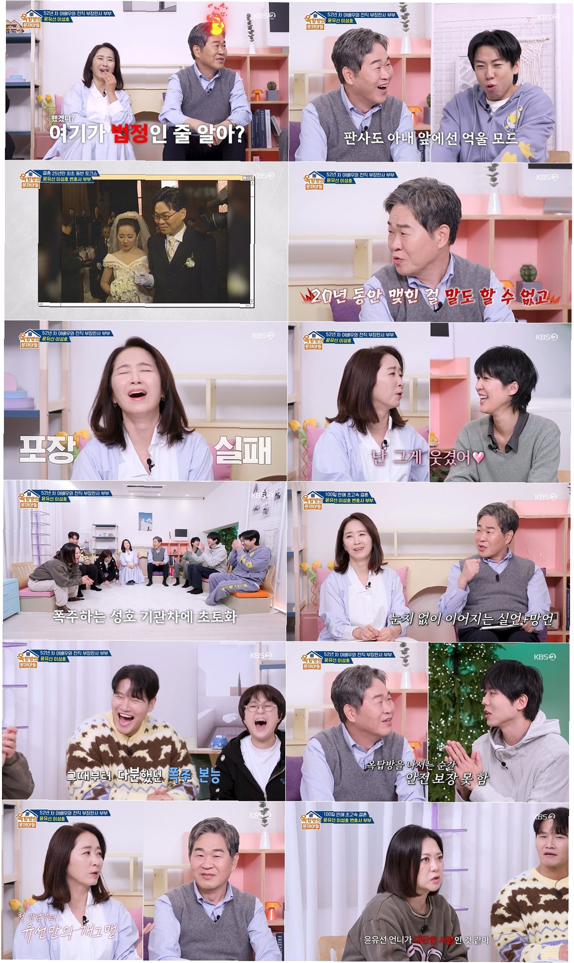 연예계 최초 법조인 부부 윤유선, 이성호가 '옥탑방의 문제아들'에 출연해 결혼 생활에 대한 솔직하고 유쾌한 폭로전을 펼쳤습니다. 시청률 자체 최고를 경신하며 화제를 모은 이번 방송은, 때로는 치열하게 때로는 유쾌하게 서로를 받아들이는 두 사람의 20년차 부부 케미를 보여주며 시청자들에게 큰 재미를 선사했습니다.