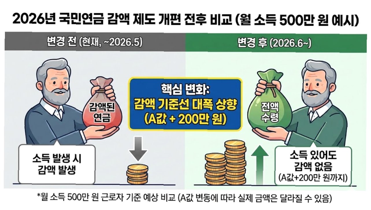 국민연금 감액 기준이 대폭 완화되어 월 소득 519만원 미만자는 연금을 전액 받을 수 있게 됩니다. 이는 초고령사회 현실을 반영한 제도로, 일하는 노년층의 근로 의욕을 고취하고 노후 소득을 보장하는 데 기여할 것입니다. 기초연금 부부 감액 완화도 검토 중입니다.