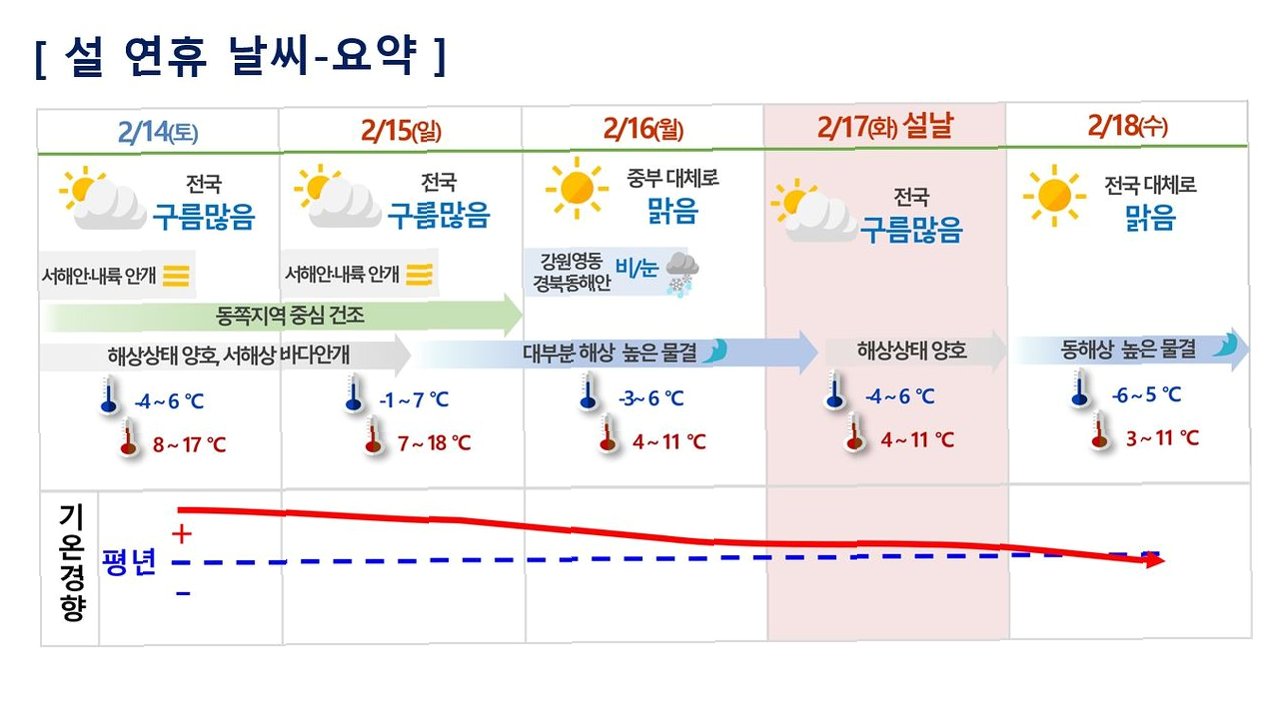설날을 앞둔 월요일에는 초미세먼지와 안개로 인한 불편은 줄어들지만, 동해안 지역에는 대설특보 수준의 눈이 내릴 수 있어 주의해야 합니다. 강원 영동과 동해안을 중심으로 비 또는 눈이 내리겠고, 특히 강원 산지에는 많은 눈이 쌓이는 곳도 있겠습니다. 또한, 설날 전후로 해상과 해안에는 강한 바람과 높은 파도로 인해 풍랑특보가 내려질 수 있어 바닷길 이용 시 주의가 필요합니다.