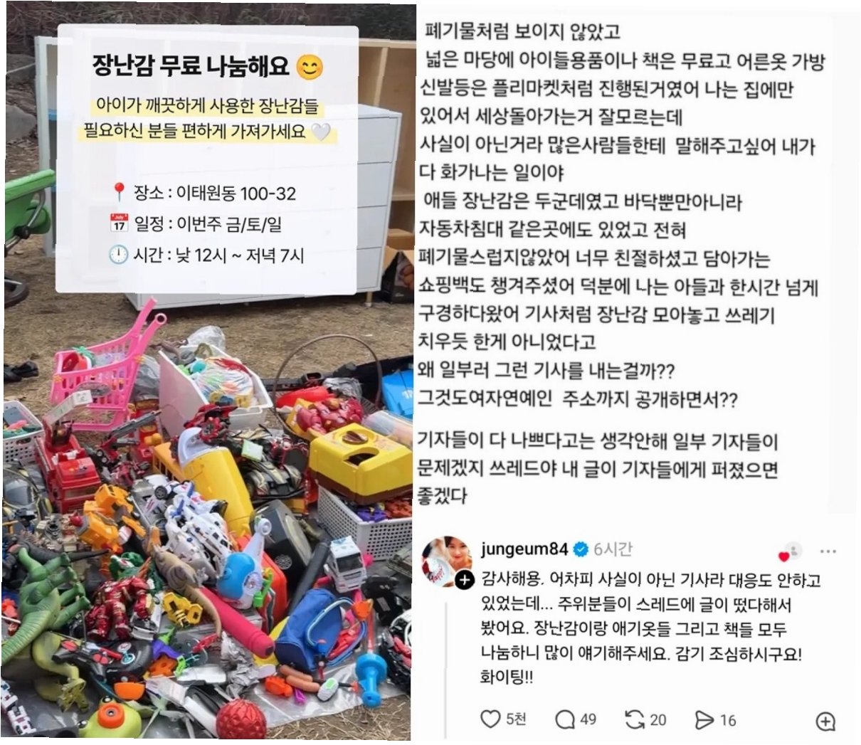 황정음 씨는 해당 관계자의 글에 직접 댓글을 달아 '감사하다. 어차피 사실이 아닌 기사라 대응도 안 하고 있었다'고 심경을 밝혔습니다. 또한 '주위에서 글이 떴다고 해서 봤다. 장난감과 아기 옷, 책들을 모두 나눔하니 많이 이야기해달라'며 나눔 행사의 본래 취지를 강조했습니다. 감기 조심하라는 따뜻한 말도 덧붙이며 소통하려는 모습을 보였습니다.