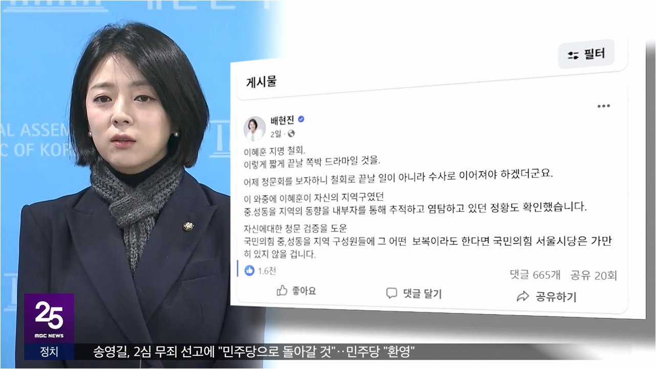 A.많은 정치인들이 배 의원을 '친한계 숙청'의 희생양으로 삼거나, 당내 권력 다툼의 일환으로 해석하며 사건의 본질을 흐렸습니다. 이는 자신들의 정치적 입지를 강화하거나 상대방을 공격하기 위한 수단으로 사건을 이용하려는 의도로 보입니다.
