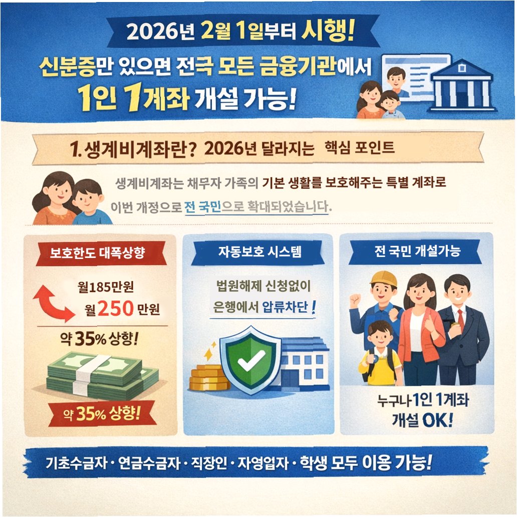 하지만 이달부터 시행된 민사집행법 시행령 개정으로 '생계비 통장'이 도입되면서 원 씨에게 새로운 희망이 생겼습니다이제 누구나 월 250만 원까지는 압류로부터 보호받을 수 있게 되어 최소한의 생활비를 지킬 수 있게 된 것입니다이는 기존 기초생활수급자 등 일부에게만 해당되었던 압류 방지 통장과 달리, 전 국민 누구나 신청 가능하다는 점에서 큰 의미가 있습니다보호 금액 또한 기존 185만 원에서 250만 원으로 상향되었습니다.