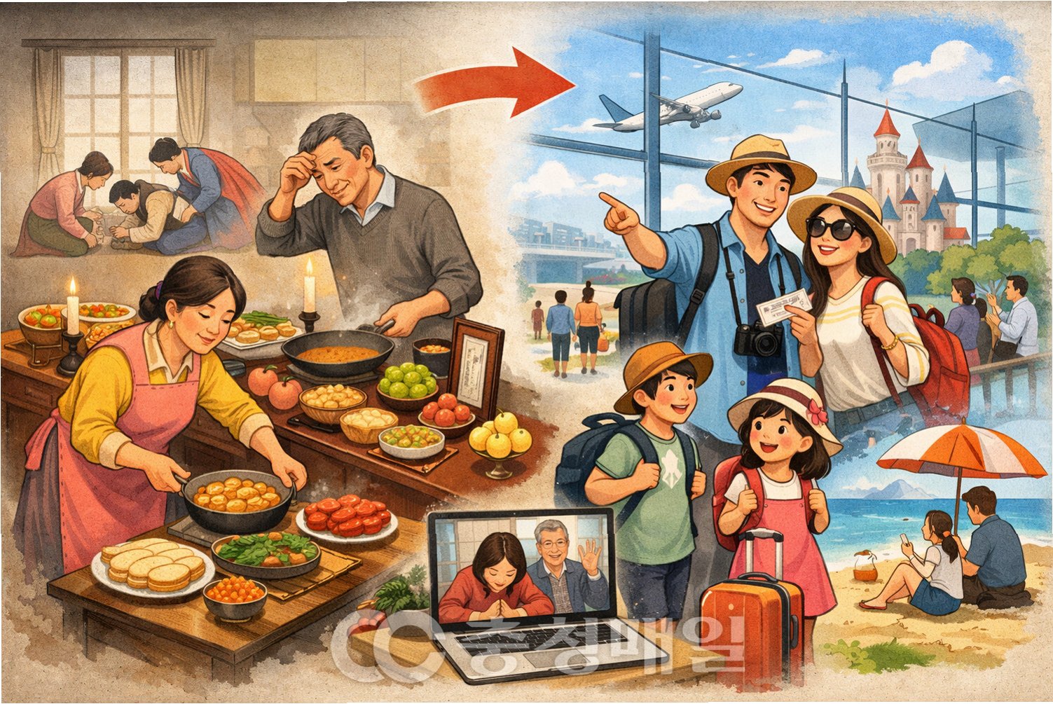 과거 명절에는 '명절 전날 시가, 당일 오후 친정'과 같은 암묵적인 시간표가 존재했습니다. 하지만 이제는 이러한 틀을 깨고 부부가 각자 부모님 댁으로 향하는 사례가 늘고 있습니다. 이는 며느리에게는 '노동의 날'로, 남편에게는 '눈치 보는 날'로 여겨졌던 명절 일상에서 벗어나고자 하는 움직임입니다. 또한, 차례상을 간소화하거나 생략하는 가정이 늘어나면서 '각자 명절'을 선택하는 것이 더욱 용이해졌습니다. 결혼 3년차 최모 씨(31)는 양가 모두 차례를 지내지 않기에 각자 부모님과 여행을 떠나는 것이 더 편하다고 느꼈으며, 외동딸인 황모 씨(32)는 어머니가 혼자 차례를 지내는 것을 염려하여 남편과 각자의 집에서 명절을 보내기로 했습니다. 이러한 변화는 명절을 가족 간의 의무보다는 개인의 휴식과 편안함을 중시하는 시간으로 재정의하려는 젊은 세대의 가치관을 반영합니다.