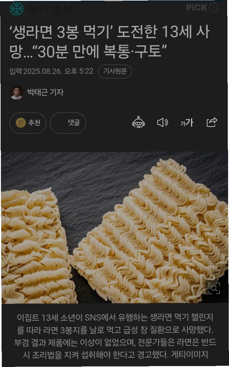 부검 결과: 생라면 섭취가 사망 원인으로 지목