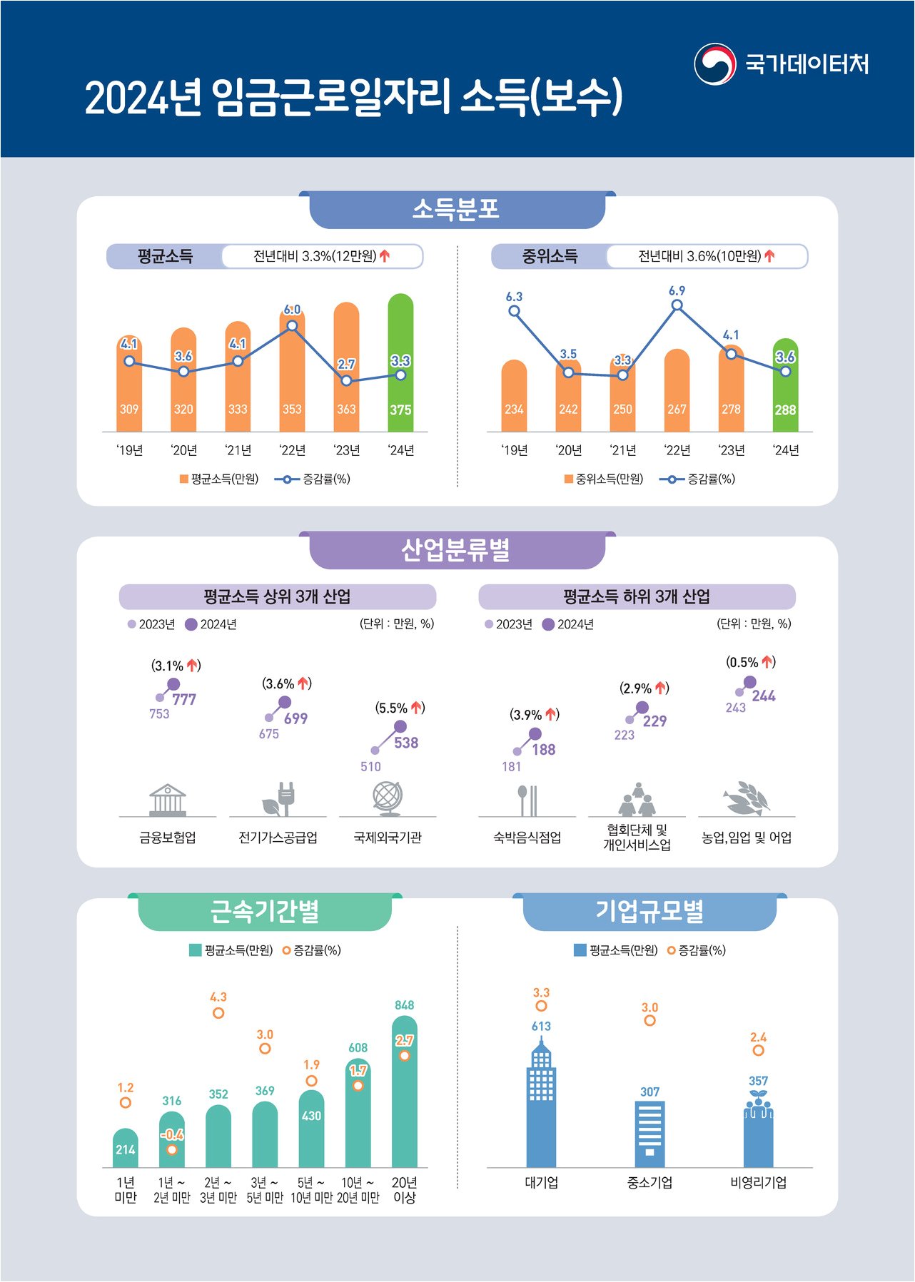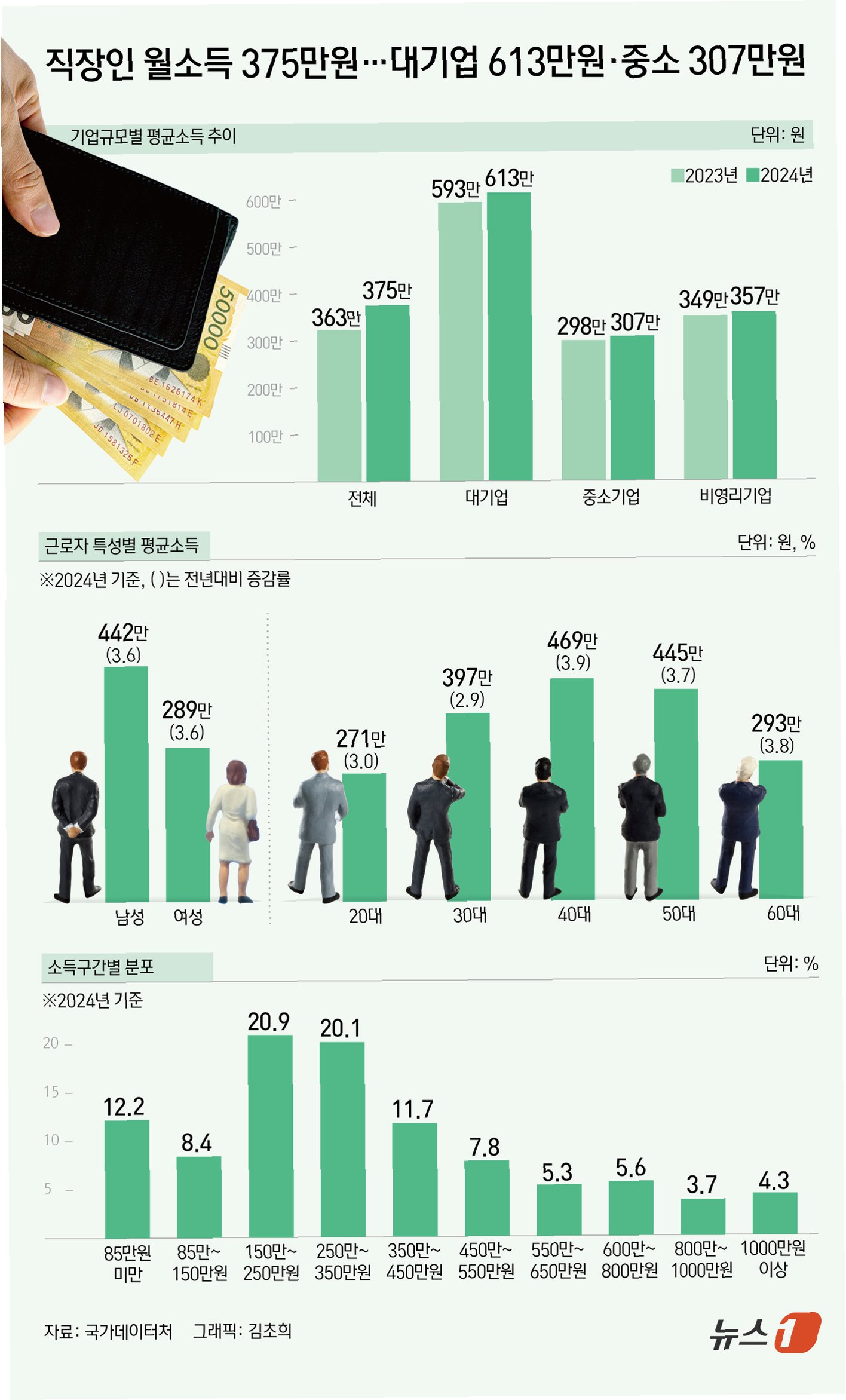 산업별로 살펴보면 금융·보험업이 월평균 777만원으로 가장 높았고, 숙박·음식점업은 188만원에 그쳐 극명한 대조를 이뤘습니다. 성별로는 남성(442만원)이 여성(289만원)보다 153만원 많았으며, 연령대별로는 40대(469만원)가 가장 높은 소득을 기록했습니다. 대형 손해보험사에 다니는 A씨는 30대 후반 월 실수령액 800만원대, 40대 초중반에는 1000만원을 넘는다고 전했습니다.