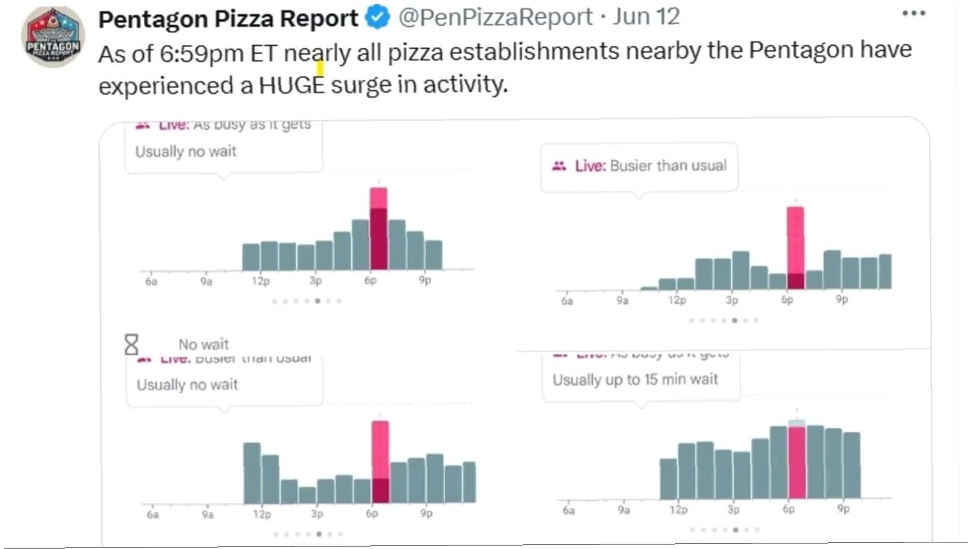 ‘펜타곤 피자 리포트’는 구글 지도의 '인기 시간대' 기능을 활용하여 국방부 인근 피자집의 주문량을 추적합니다. 저녁이나 심야에 주문이 급증하면, 이는 군 고위급 관리들이 평소보다 늦게까지 근무하며 작전을 준비하거나 진행 중일 가능성을 시사한다는 발상에서 시작되었습니다. 이 계정은 과거 이스라엘의 이란 공습 직전 국방부 인근 피자집들의 활동량 급증을 포착한 사례를 통해 그 가능성을 보여주었습니다.